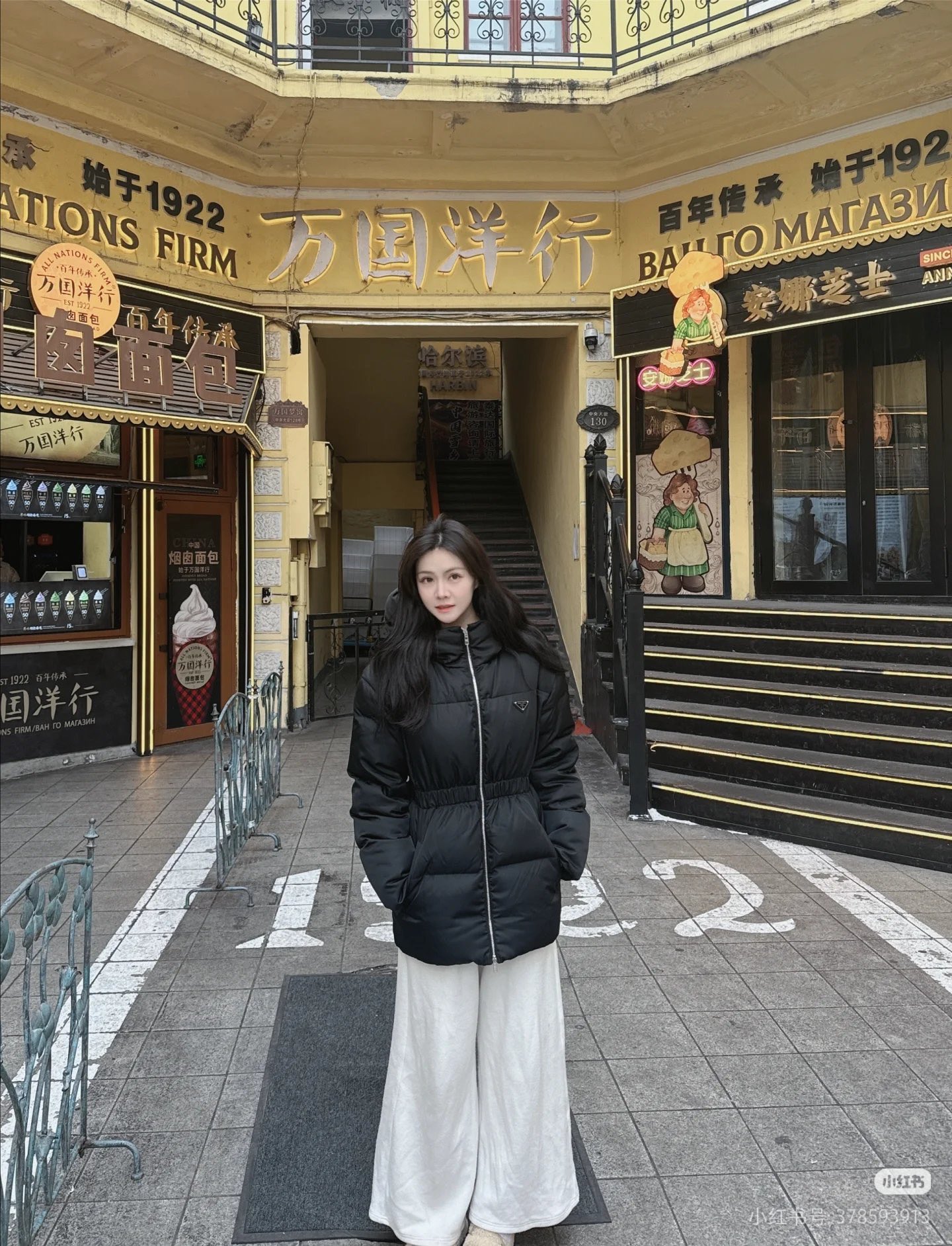 Prada/普拉达 女士三角标收腰中长款羽绒服上身效果#