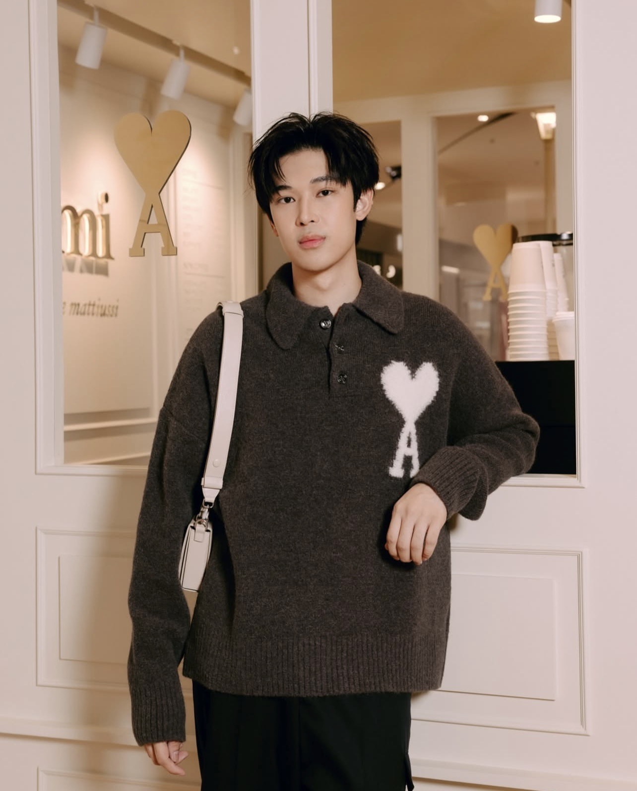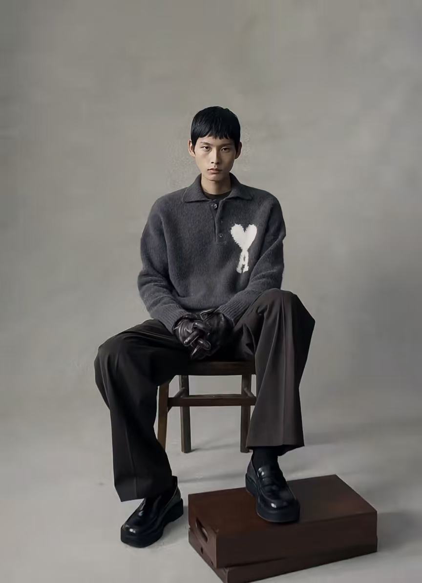 AMI PARIS 爱心图案休闲针织POLO云朵毛衣 上身效果#