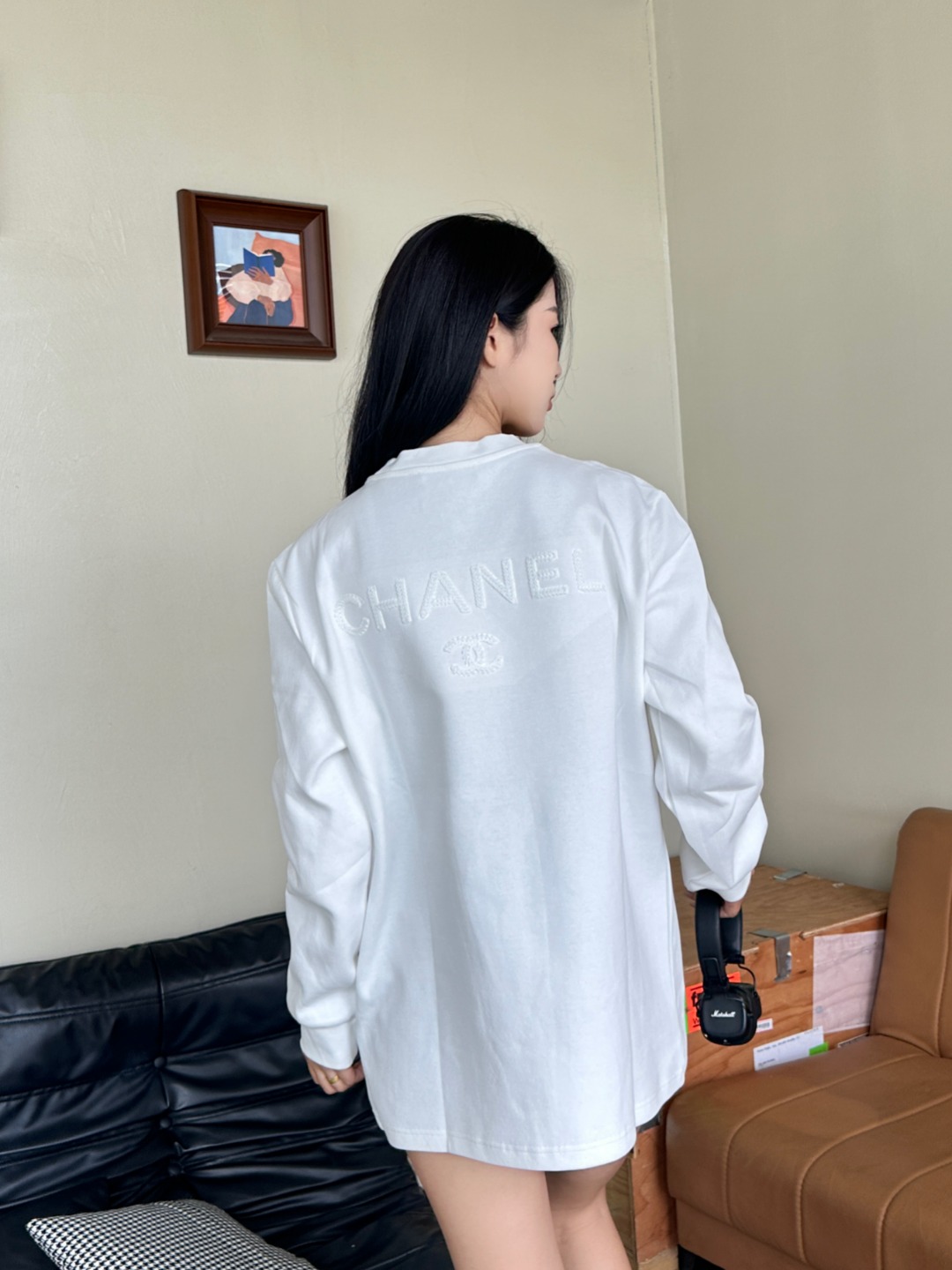 CHANEL/香奈儿 25Fw 暗纹编织logo双C立体刺绣长袖T恤 上身效果#