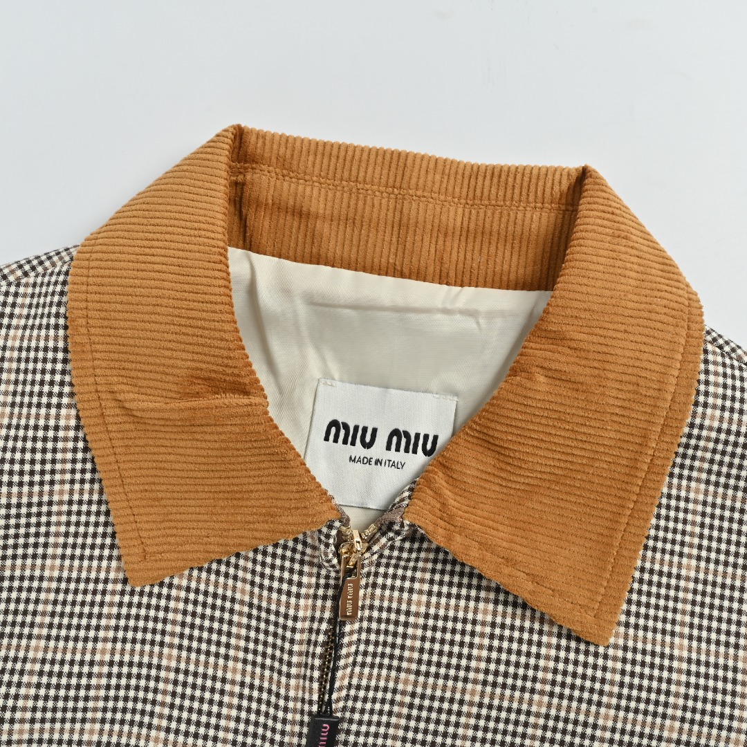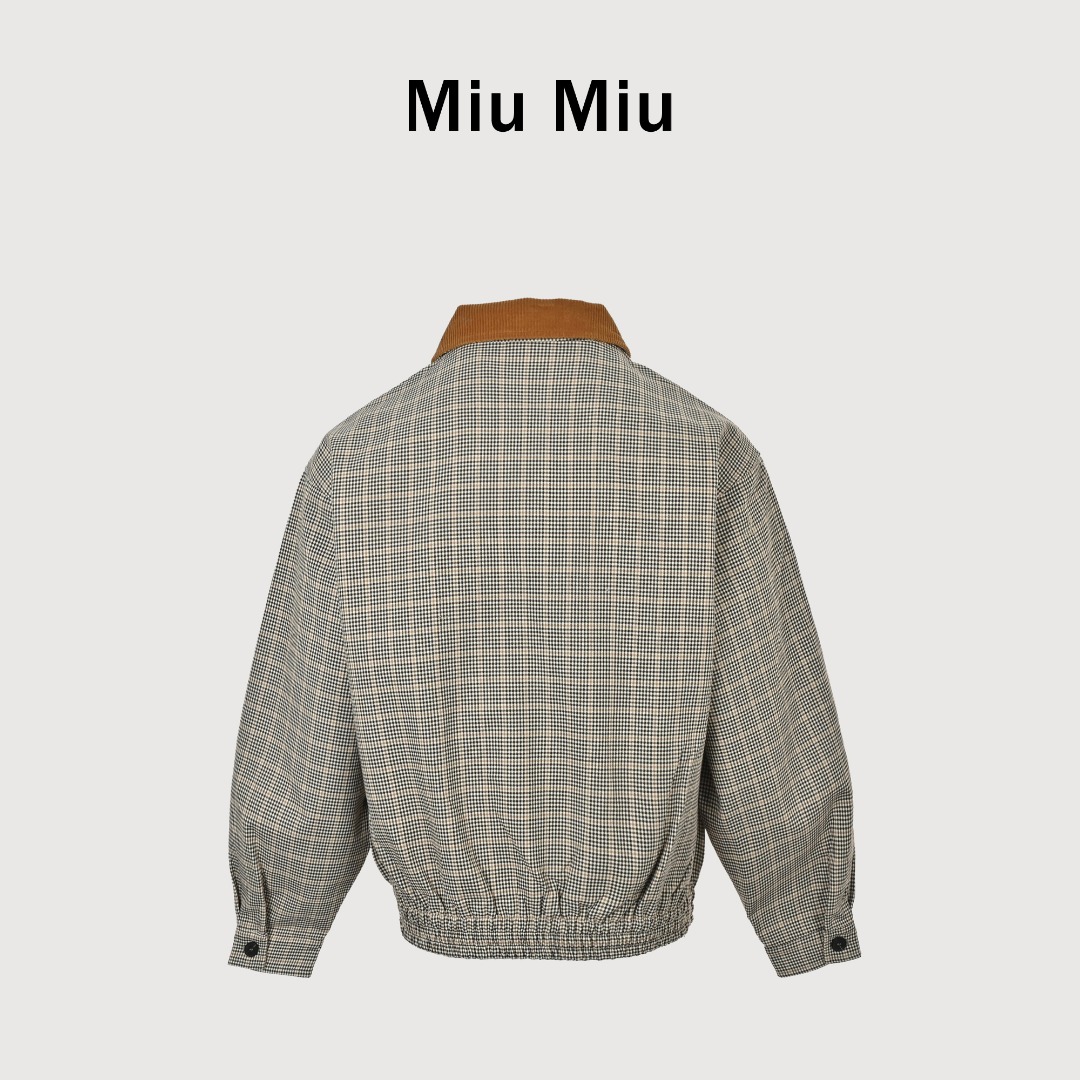 本地自取💰360 MIUMIU 缪缪 25FW 灯芯绒领格纹夹克外套 采用格纹图案,重新演绎miu 风格中典型的。探索撞色灯芯绒质感衣领与双层织物面料的时尚可能,体现复古与时尚之间的平衡。整体走线平直细腻,面料舒适柔软,颜色一致无色差 能与同款搭配营造时尚造型,驾驭各种场合,定制辅料,三标齐全,男女同款! 尺码:38 40 42 44
