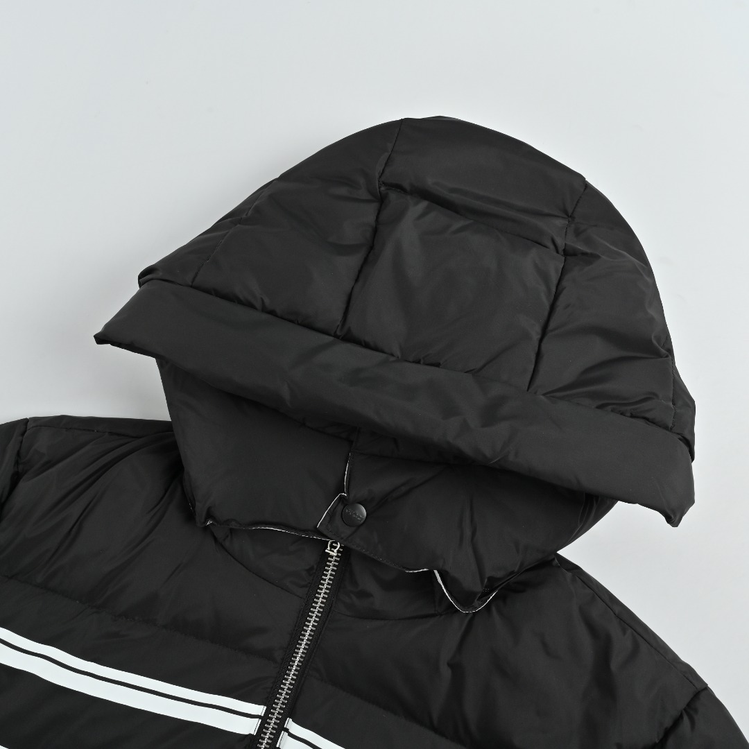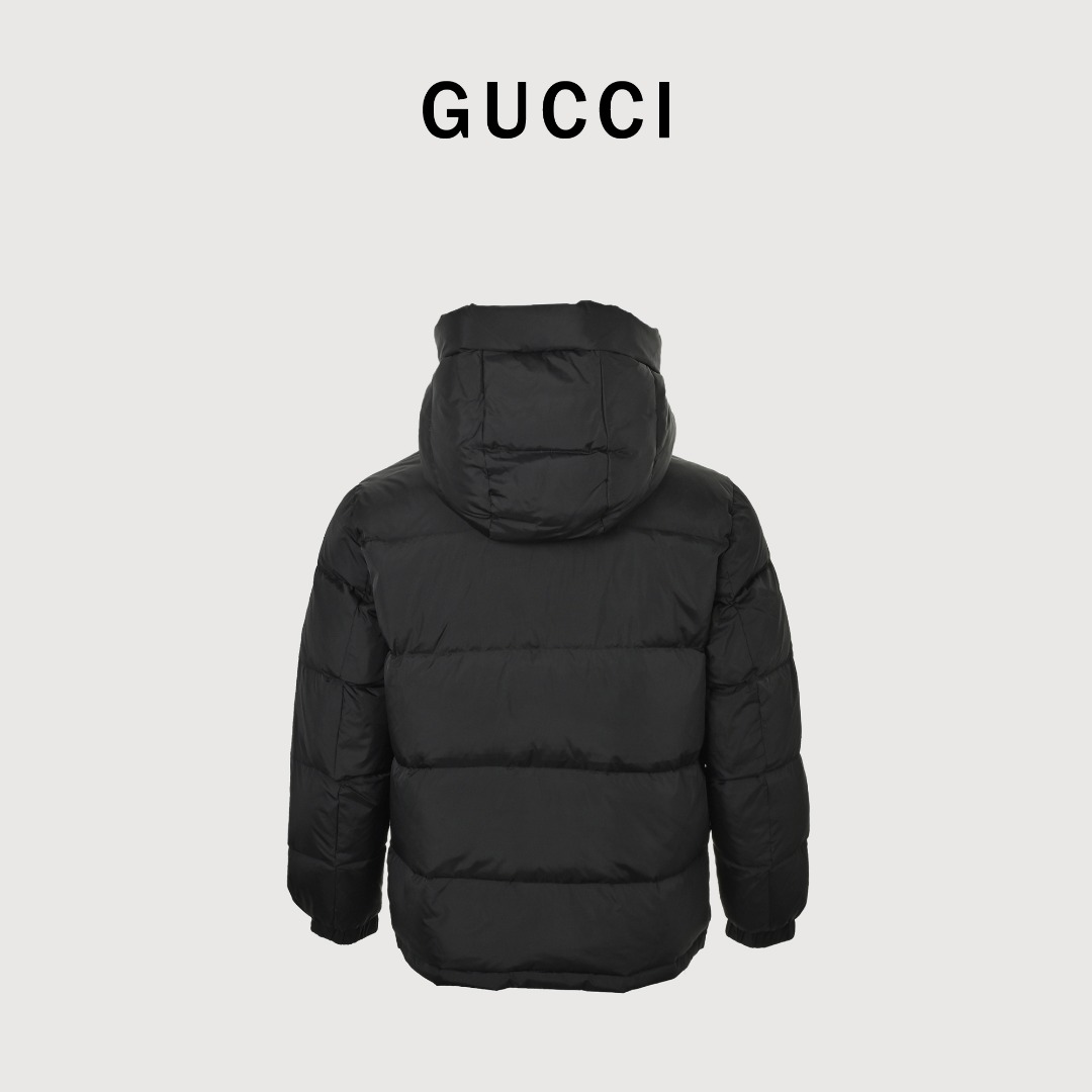 本地自取💰𝟕𝟎𝟎 𝐆𝐮𝐜𝐜𝐢 条纹连帽羽绒服 古驰 胸前logo条纹 男女同款羽绒服 𝐒𝐢𝐳𝐞:𝟒𝟐 𝟒𝟒 𝟒𝟔 𝟒𝟖 𝟓𝟎 • 版型:属于短款连帽羽绒服,版型较为宽松,能够营造出休闲且具时尚感的穿搭风格,对身材的包容性较好,适合多种身形的人群驾驭。 • 色彩:主体采用深蓝色,这种颜色沉稳大气,同时带有一定的光泽感,提升了整体的高级感;中间的黑色织带搭配白色条纹,形成经典的撞色设计,增强了视觉层次感。 采用高端鹅绒羽绒服