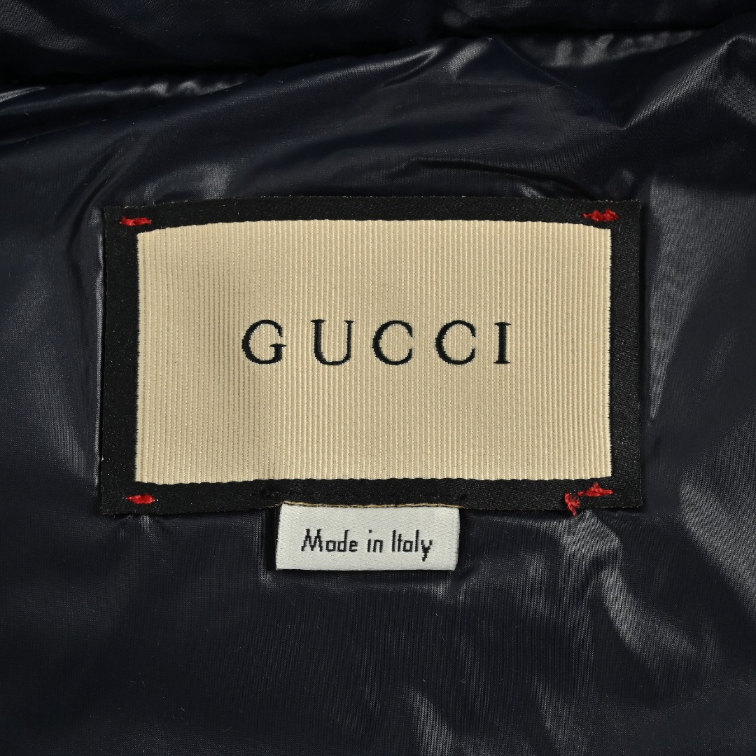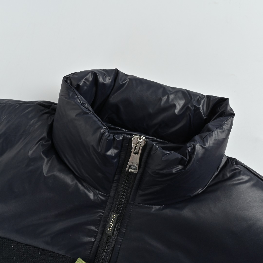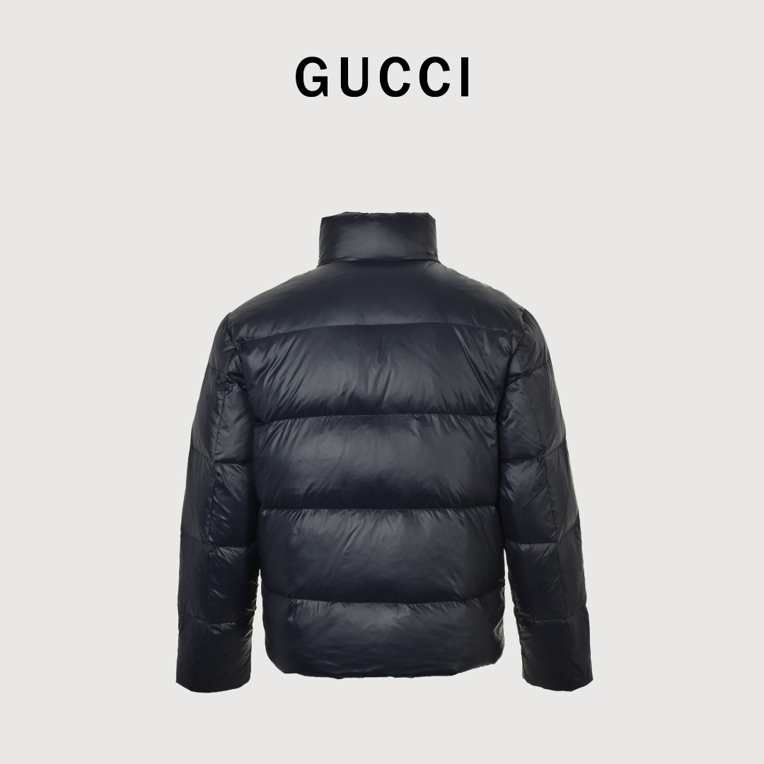 𝐆𝐮𝐜𝐜𝐢 立领条纹羽绒服 本地自取💰𝟔𝟔𝟎 古驰 胸前logo条纹 男女同款羽绒服 𝐒𝐢𝐳𝐞:𝟒𝟐 𝟒𝟒 𝟒𝟔 𝟒𝟖 𝟓𝟎 • 版型:属于短款立领羽绒服,版型较为宽松,能够营造出休闲且具时尚感的穿搭风格,对身材的包容性较好,适合多种身形的人群驾驭。 • 色彩:主体采用深蓝色,这种颜色沉稳大气,同时带有一定的光泽感,提升了整体的高级感;中间的黑色织带搭配白色条纹,形成经典的撞色设计,增强了视觉层次感。 材质分析 • 面料采用高光泽的尼龙材质,这种材质具有良好的防水、防风性能,同时质感挺括,能让羽绒服保持饱满的廓形,且易于清洁和打理。 • 填充物应为高品质鸭绒或鹅绒,从蓬松度来看,保暖性能优异,能够在寒冷的季节为穿着者提供充足的温暖。 设计细节 • 品牌标识:正面醒目的“GU**i”白色字母刺绣,以及袖子上的品牌标志性双G元素圆形徽章,强化了品牌辨识度,是品牌身份的直观体现。 • 拼接设计:胸前的黑色织带与白色条纹拼接,打破了纯色面料的单调感,同时织带的材质与羽绒面料形成对比,增加了设计的丰富度。 • 功能性设计:立领设计可有效阻挡寒风;双向拉链方便穿脱和调节保暖度;两侧的口袋带有金属扣装饰,既具有实用性,又提升了细节处的精致感。
