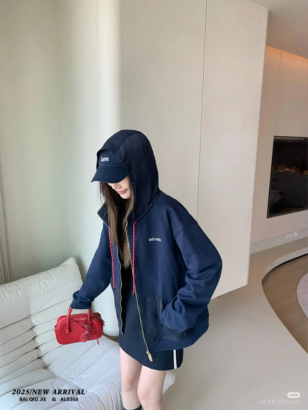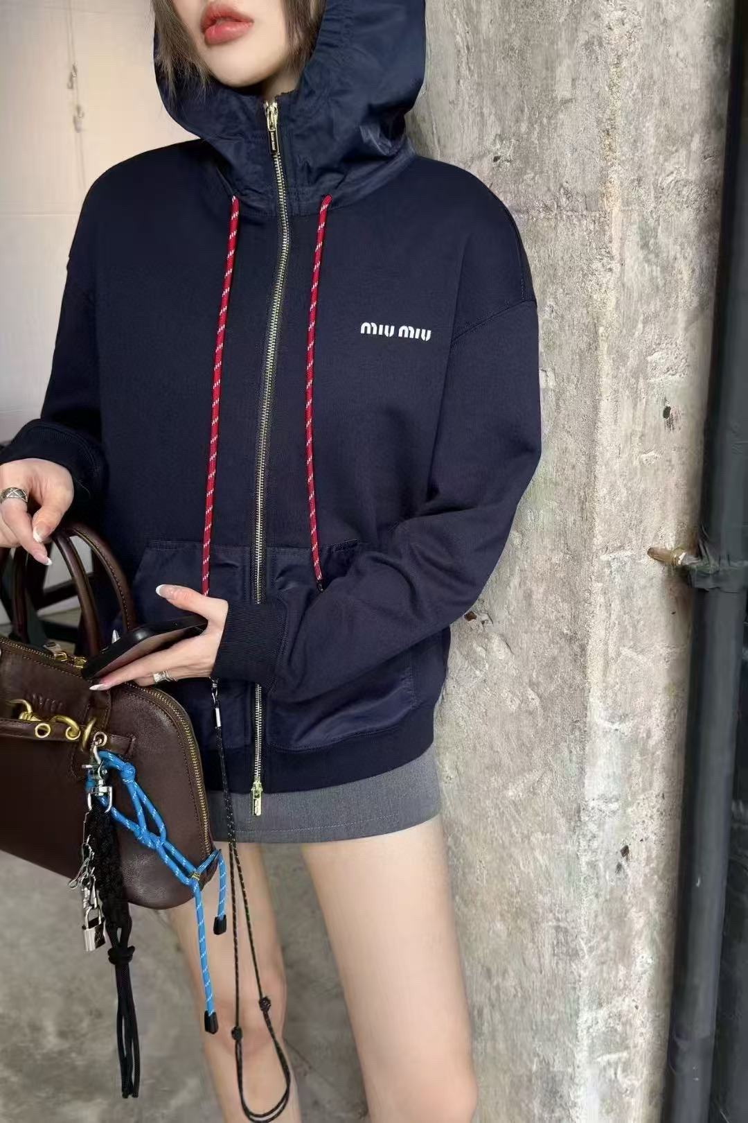 Miu Miu/缪缪 25Fw 刺绣小标拼接拉链连帽外套上身效果#