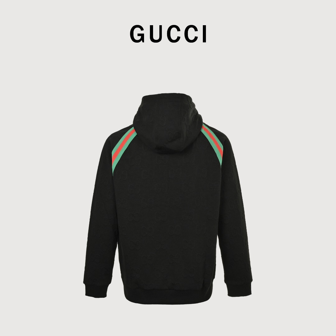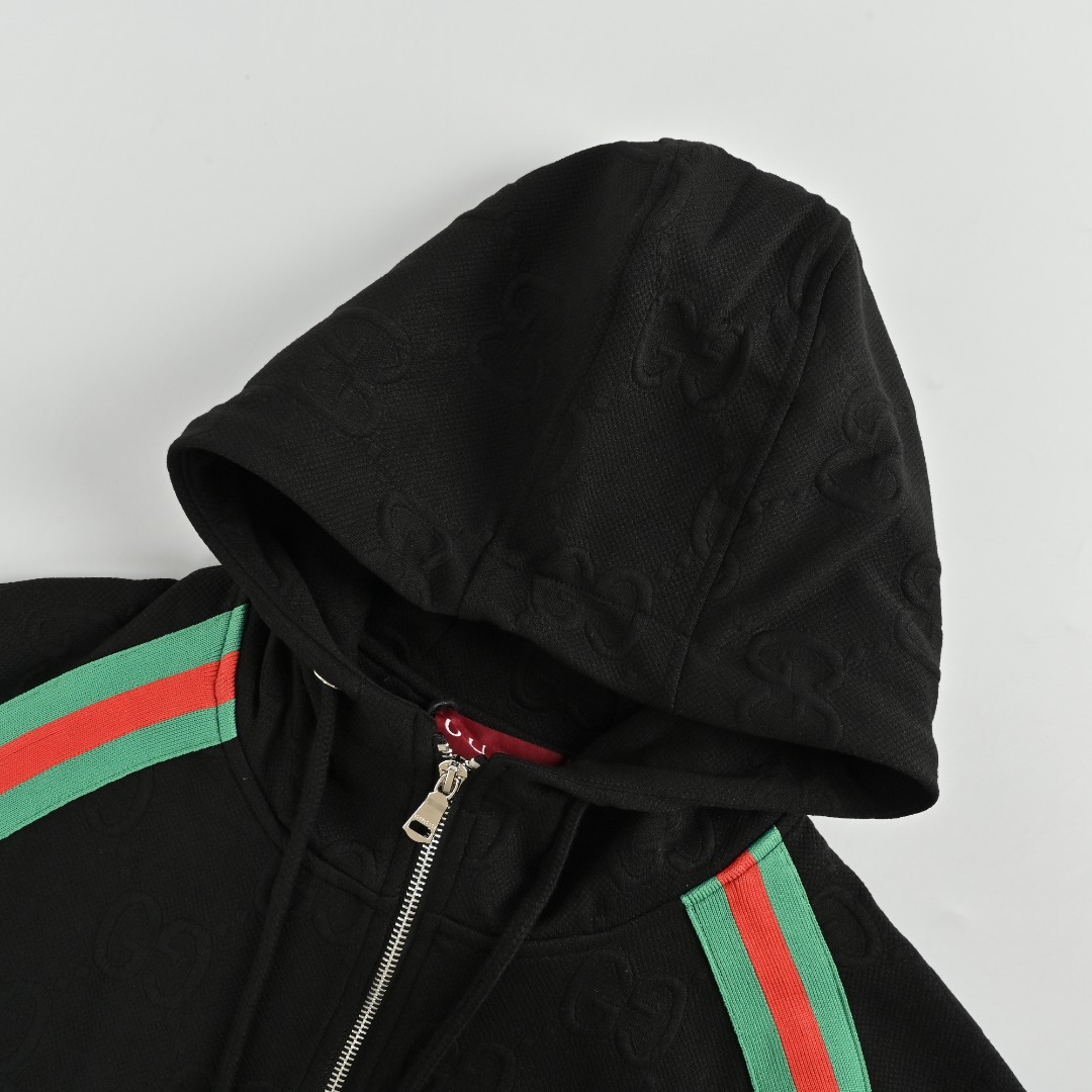 本地自取💰260 Gucci/古驰 25Fw 双G暗纹提花红绿织带拼接连帽套装拉链外套 这款GG平纹针织面料借鉴复古运动装设计,诠释了系列的经典学院风格。 品采用拉链开合设计,前胸经典红绿织带设计,双字母提花面料搭配绿红织带秋季爆款外套, 颗粒绒面料穿上就是舒适自在又显瘦的存在,慵懒而随性, 结合干净简单的色系就特别耐看,搭配同系列长裤 腿部侧边红绿织带点缀 细节满分 休闲宽松版型 显瘦百搭 适合日常通勤约会 搭配运动鞋或小白鞋都很好看! 搭配同款长裤更佳! 颜色:黑色,白色 Size: S-XL