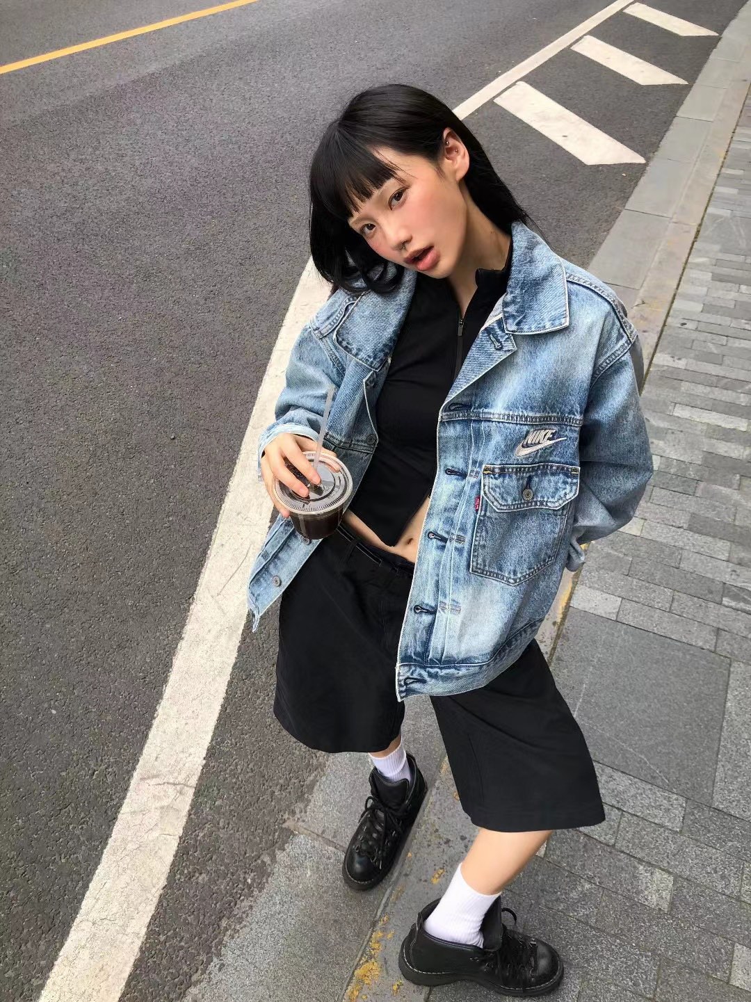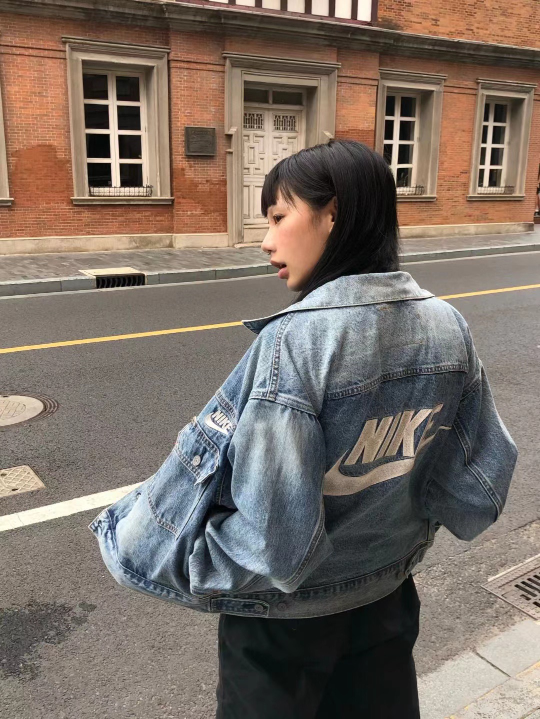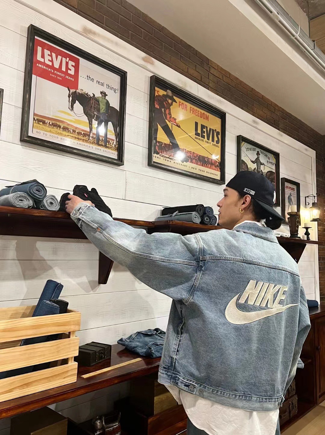 Levi’s x Nike 最新联名款 纽扣双口袋logo宽松休闲舒适翻领牛仔外套 上身效果#