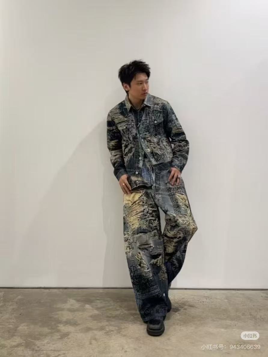 Acne Studios 2023M错视糜烂破坏涂鸦3D打印bay宽松撕裂涂鸦打印牛仔裤 上身效果#