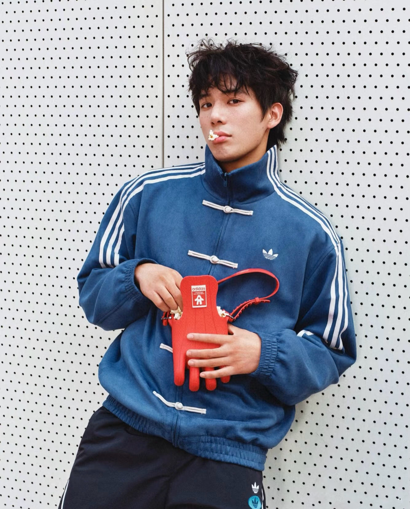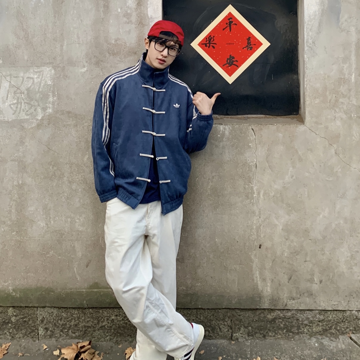 adidas三叶草新中式麂皮唐装外套 上身效果#