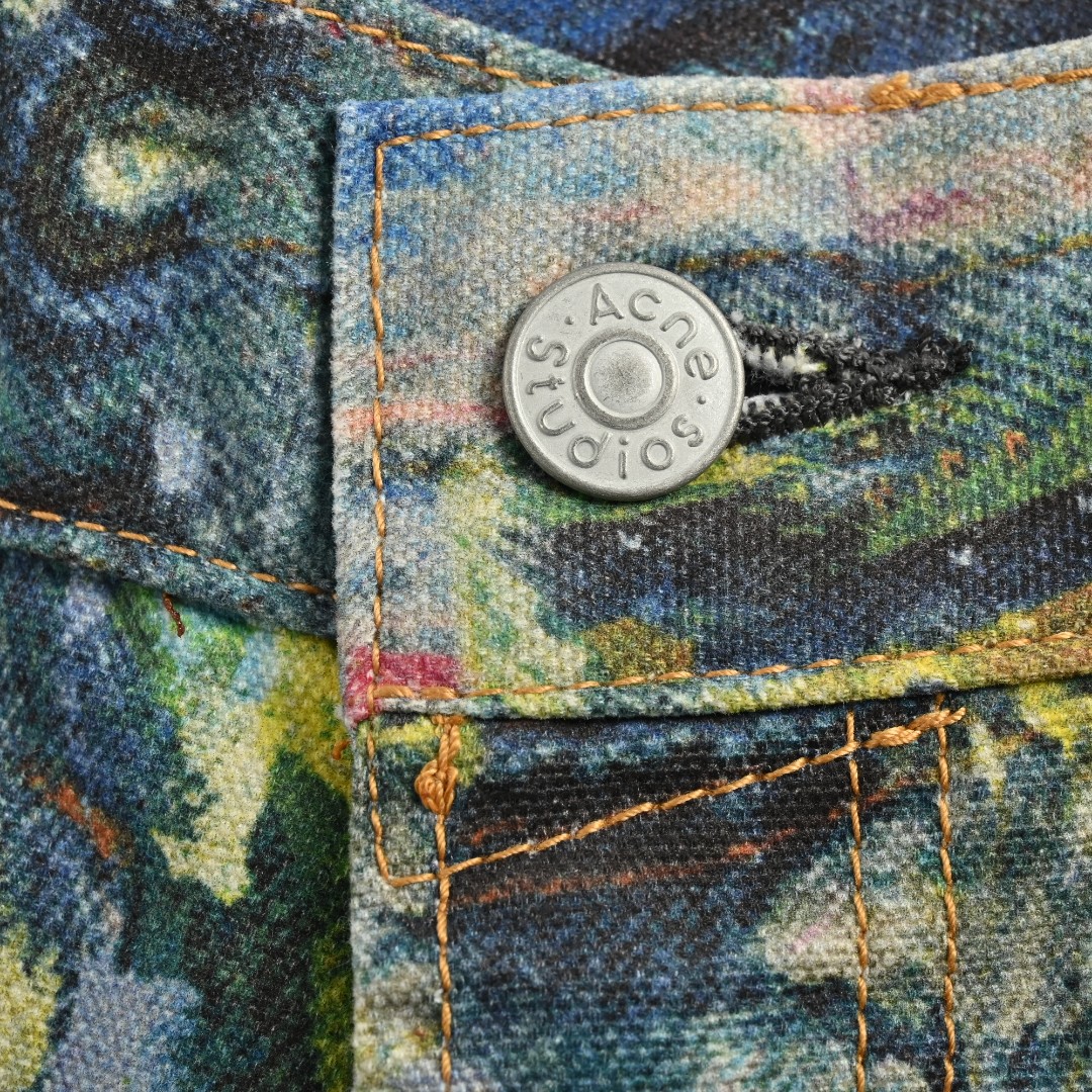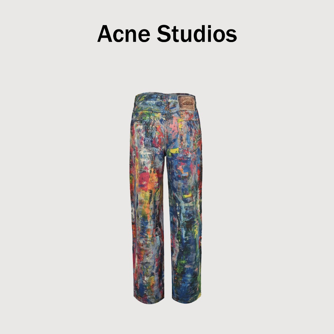 本地自取💰340 Acne Studios 24Fw 彩色油画牛仔长裤 这款油画裤绝对是比打印之前的挂坠裤难度升级,之前试过用回挂坠裤的面料,发现根本还原不到原版的色调,打印起来只有七分像,后面单独找了另外合作商的面料定制,面料底色会比原来的深点,厚薄度也跟原版接近,并且真正做到打印落色定位和解决色调不够的问题,这款面料可以说专门为这款裤子所诞生的,印花全部都是定点扫描,裤脚的车线也是定染同色,密度一致,打枣位置也是一致,这次用的新面料不同之前1981m的打印裤面料,14oz单独定制棉麻底部面料才能配合3d打印油画落色,1981宽松的版型,不管在男女身上都超级帅,回头率是666%,整条裤子是3D的数码印花,采用红蓝对撞的错位效果甚至有点莫奈的朦胧感 Size:34 36 38 40