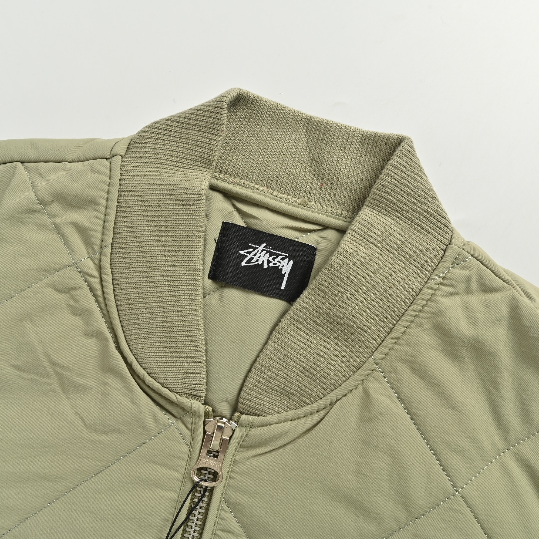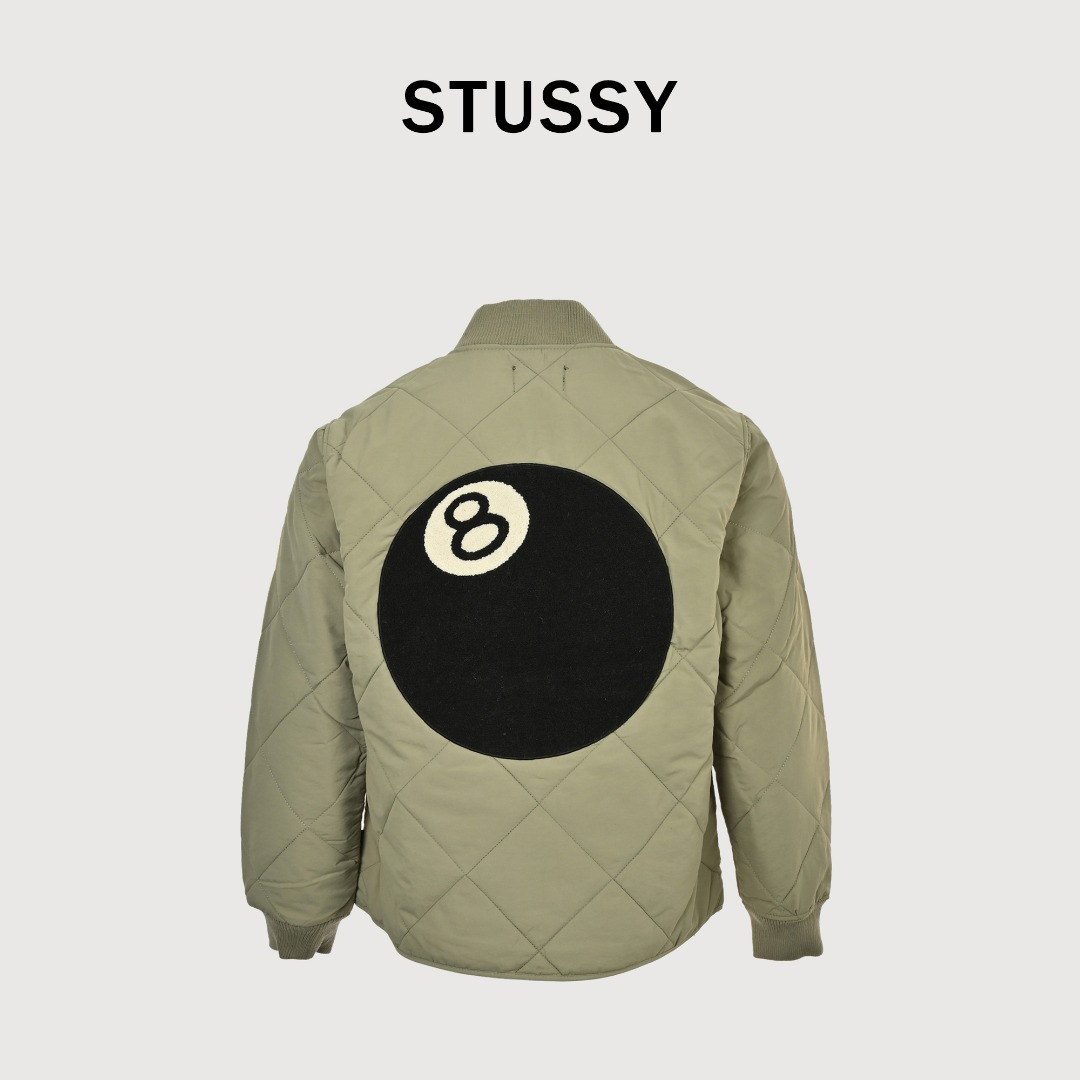 本地自取💰260 STUSSY 23FW 斯图西黑8台球拉链棉服夹克外套 🎱 BALL QUILTED LINER JACKET 首先,先讲讲工艺,整件衣服全部菱形格子都要对位,需要一件件手工裁剪才行,整整耗时七天才能裁完。 全包边设定,等于一个拼接位要车缝三次!!! 先打边收口,再用原身布两边包起来,好看是好看,要花费三倍的时间,工钱也是三倍 后幅的黑8绣花,是先做好一个绣花章,再缝上去的。采用了羊毛混涤纶的面料,比纯涤纶要贵两倍,但手感舒服且柔软。整体也是比较软的,后背不会有硬硬的异物感 采用正品YKK拉链,顶普通的无牌拉链3条有多了。YKK官方测试实用一万次无损,上下拉合非常顺滑不拉扯。 领子采用和原版一致的羊毛混纺材质,硬挺有型,不会松松垮垮的 颜色:黑色 卡其色 绿色 尺码:M-XXL