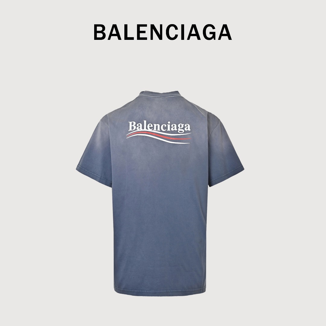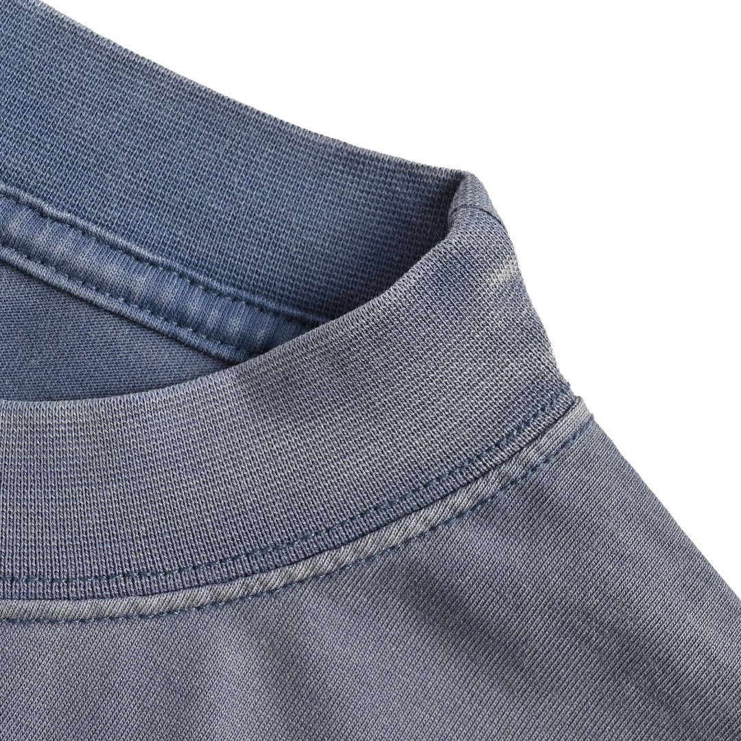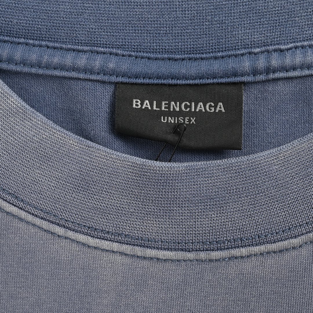 本地自取💰180 Balenciaga/巴黎世家 25ss 日晒褪色可乐印花短袖-雾霾蓝 -常规胶浆印花,非龟裂纹印花 -a字母与波浪线无限接近,但不重叠 在巴黎去年各种洗褪系列的推出,经典的可乐洗褪配色终于来了,个人觉得目前经典可乐最好看的一个配色,接下来我们来分析一下工艺,因为这款衣服后面涉及到炒盐工艺,喷马骝,通过衣服的反面能看出这次雾霾蓝可乐工艺的工艺为炒盐工艺,再进行喷马骝其实正品的正确工艺是染布再去炒盐,通过锁线位置的褪色,可以确定此款用的是高品质棉线,因为普通棉线承受不起洗水工艺的;涤纶线虽然强度够,但无法通过后期染色来上色跟褪色,现在很多所谓高版本也是用与衣服接近色的涤纶线,所以,看似简单的衣服其实也暗藏着繁琐的工艺,也使巴黎的洗褪款比普通款要贵了差不多三分之一 Size:S-XL