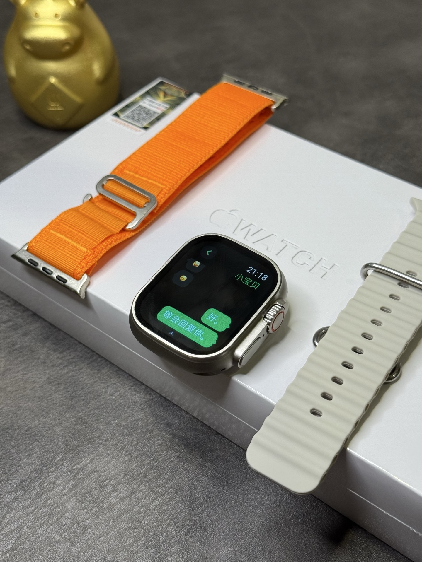 支持登录微信‼️💰200 苹果AppleWatch Ultra2苹果手表 京东升级版 新增回复微信消息功能‼️各位期待的升级款来了 目前唯一能在手表上直接回复微信消息的1:1苹果手表 莆田京东升级款 外包装跟正品一样带苹果图标 到手逼格跟正品无异!区别市面华强北一眼假版本 49mm钛合金边框 标配Amoled高清屏 黑边非常小 398mah高压电池 常规使用续航可达3天左右 全触海栎创816D触控方案 操作顺滑 运行流畅不卡顿 IP67级防水日常洗手/淋雨都不怕 新增功能1️⃣ 健康监测,贴心守护:内置专业的心率、血压、血氧传感器,实时精准监测身体指标。睡眠监测功能也很强大,能分析睡眠质量,给出改善建议,就像私人健康管家,时刻关注身体状况 新增功能2️⃣ 蓝牙5.3连接超稳定,来电、短信、微信等通知实时提醒,支持手表回复微信消息!AI语音助手超智能,查天气、设闹钟等 新增功能3️⃣ 支持运动记录助力锻炼:支持跑步、骑行、瑜伽等几十种运动模式,自动识别运动状态,精准记录运动轨迹、步数、卡路里消耗等数据。 新增功能4️⃣ 支持微信、支付宝双支付,出门不用带钱包,抬手一扫就能付款,购物、乘车超方便。还具备NFC功能,刷门禁轻松进出小区、办公楼。 新增功能5️⃣ 支持下载小软件 上传照片/音乐等操作 手表可存储音乐 不带手机也能连接蓝牙耳机听歌 功能非常多 欢迎各位到手亲自把玩! 手表支持售后保修 非人为造成的免费保修三个月 屏幕膜不撕支持退换‼️