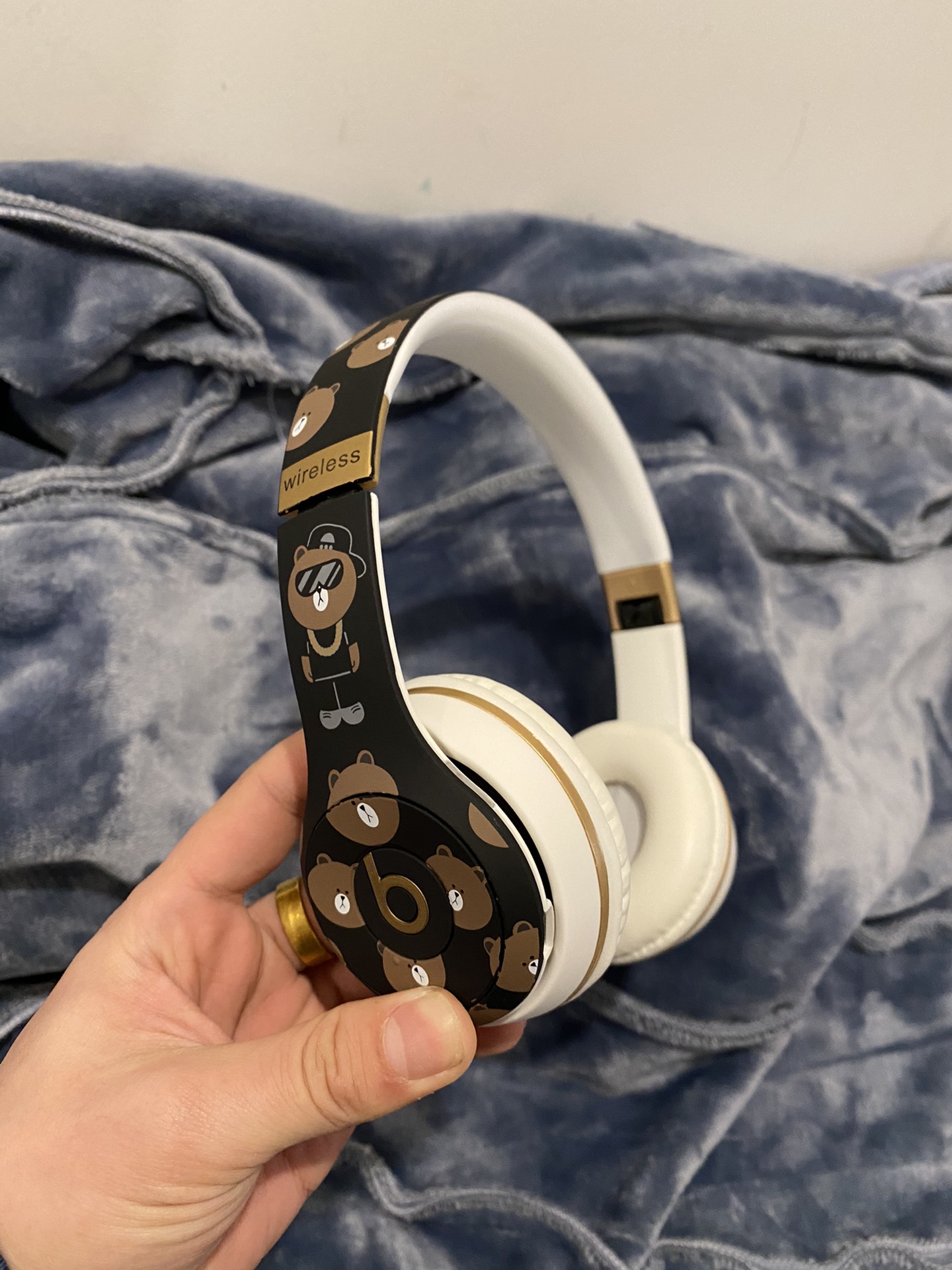 本地批💰65 Beats Solo3 布朗熊限定款 独特的喷绘设计 使图案更清晰 完美适配苹果手机 安卓手机通用!音质也是浓浓的beats渲染 官网售价2000➕ 让喜欢戴耳机的消费者望而却步,先行版虽然没有正式版配置丰富,但是性价比超高,然而这个系列的耳机🎧音质都是一流的!售出0⃣售后!大家可以毫无压力的自留,送人都不丢面!