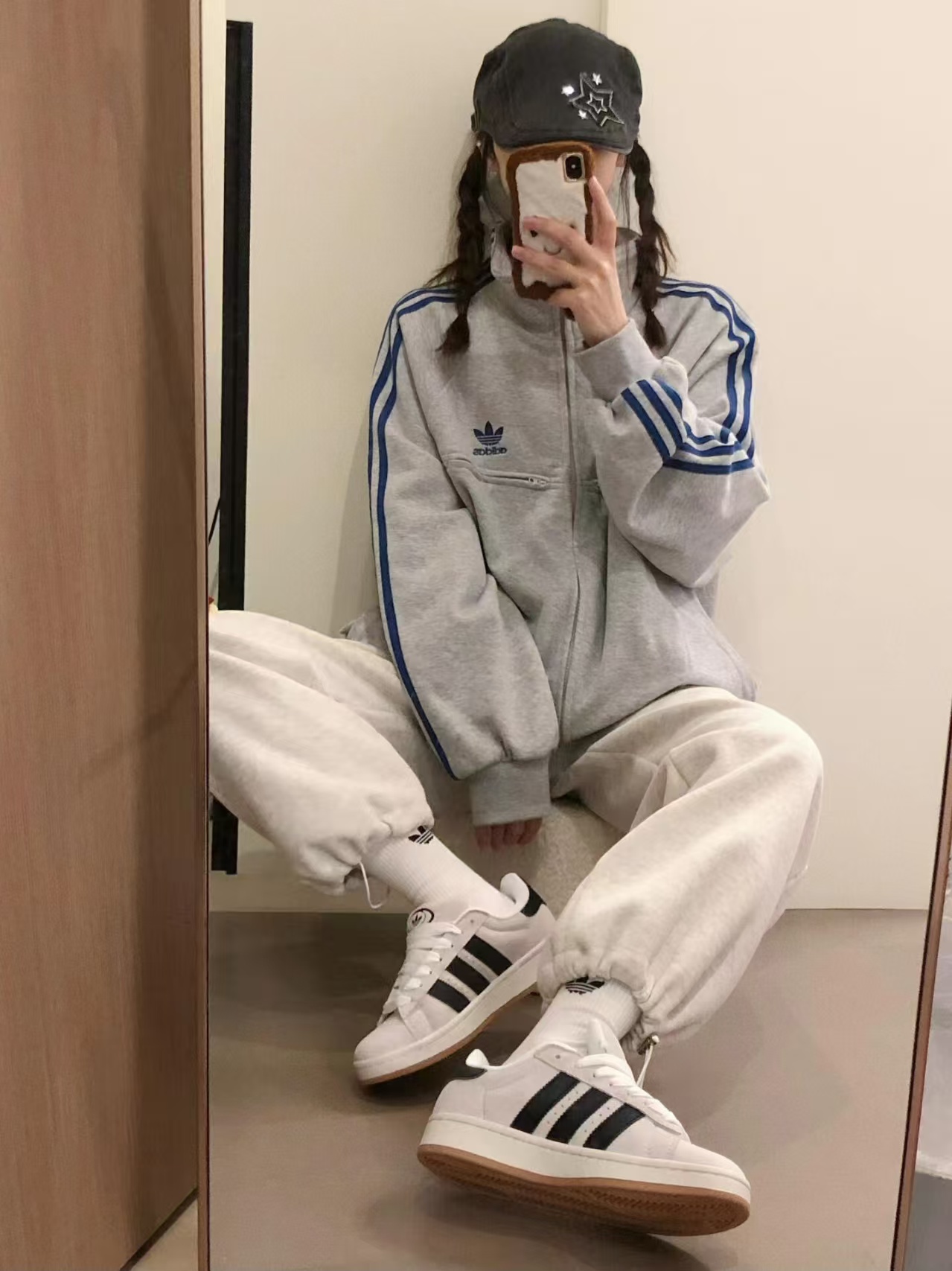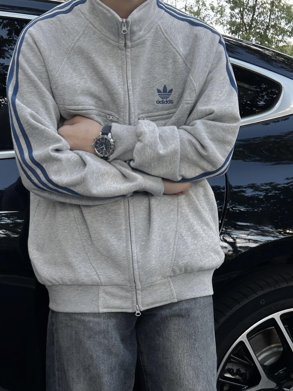 99💰 #FF9899 资讯图 三叶草Adidas春秋季休闲宽松运动三条杠刺绣美式复古翻领外套 男女同款 全新阿迪达斯经典款,灰色主体配蓝色三条杠,男女同款,胸前小logo刺绣,两侧拉链口袋实用。面料舒适透气,做工精细,拉链顺滑。 颜色:灰蓝色 码数:S M L XL 胸围:116 120 124 128 衣长:67 69 71 73 肩袖长:73 75 77 79