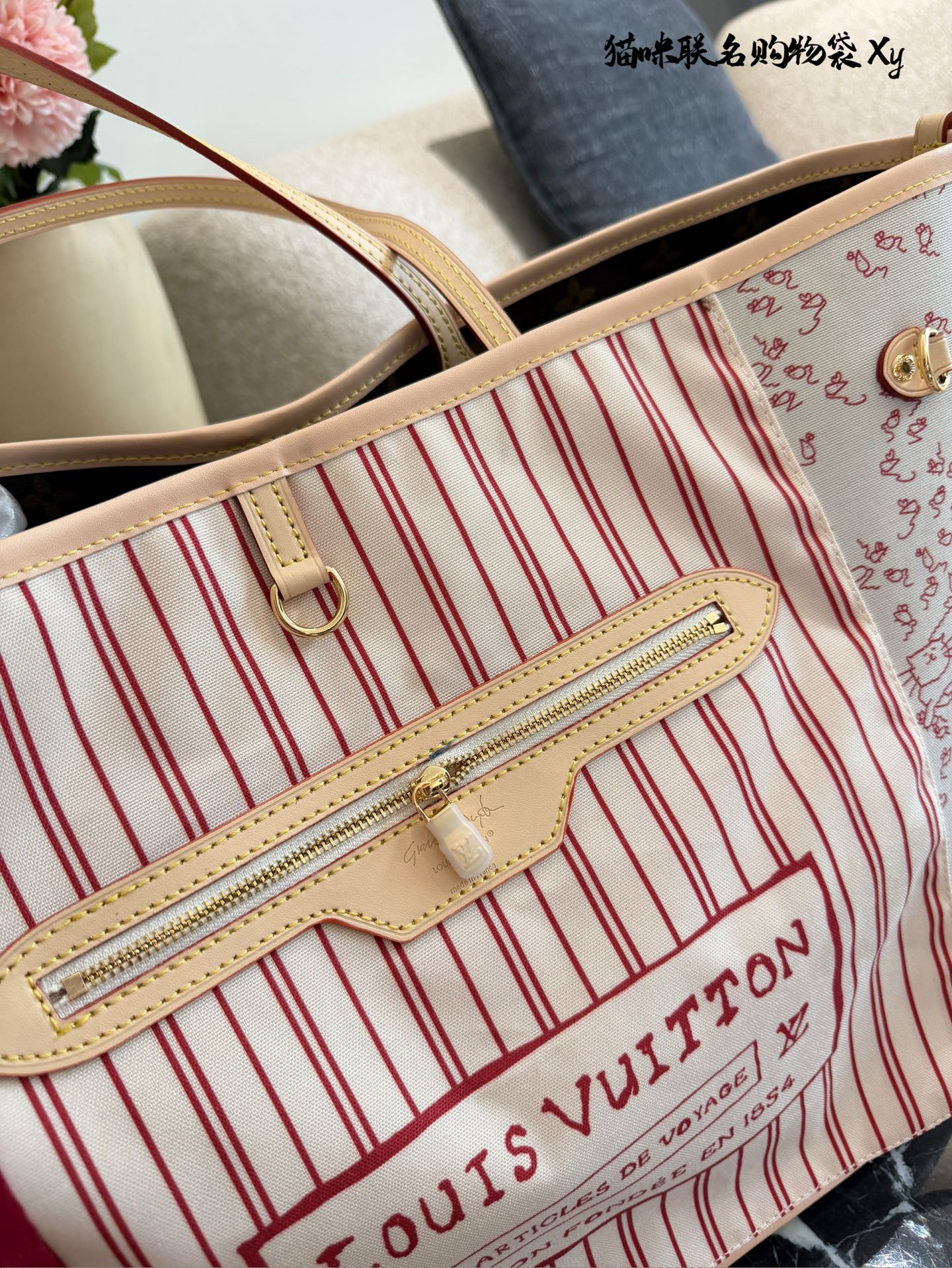 LV猫咪联名购物袋💰280 这是- -款L ouis Vuitton与Grace Coddington联名的猫咪主题购物袋,设计上融入了可爱的猫咪图案和经典的LV条纹元素。包包采用柔软的帆布材质,轻便耐用,适合日常使用或旅行携带。内衬也有猫咪图案,细节满满。 35cm无盒