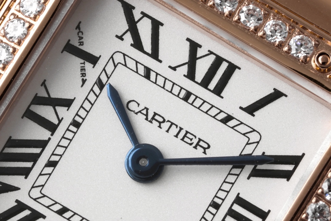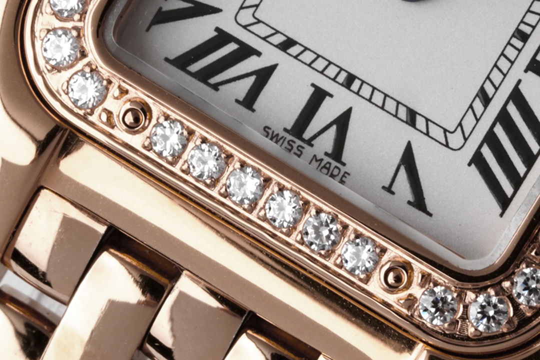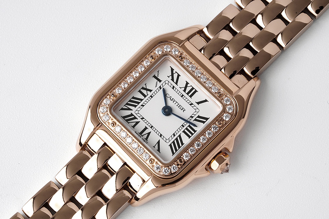 BV最新升级版本【小号22X30MM】 卡地亚Panthère de Cartier猎豹腕表使用方形双层表壳看起来更加立体大方,更加突显出腕表的优雅与经典。白色表盘上,卡地亚式时标设计更为腕表注入一份品牌的魅力。蓝色中央时分针宛若在两只随时间而舞动的精灵,为整款腕表再填华彩。 与传统卡地亚腕表一样,表冠上镶嵌有一颗具有品牌代表性的蓝宝石,向观表者展现高级钟表珠宝品牌卡地亚的独有魅力。表冠采用防滑纹理设计,方便对腕表的调试。两边的表冠护桥也为腕表增添了一份安全防护。 相比背透设计,密底工艺可以保障腕表机芯安全性。18K黄金表盖上,镌刻卡地亚英文标识的下方,WATER RESISTANT 更是对腕表防水性能的保障。灵活自如的链节表链是腕表另一大亮点,处处都散发着曜目而饱满的光芒,从上到下都充满着独特的优雅奢华气质。 1⃣️尺寸:22X30MM、厚度6MM 2⃣️表壳:316精钢 3⃣️表盘:经典镀银白色 4⃣️表针:烧制钢蓝 5⃣️玻璃:蓝宝石水晶 6⃣️表带:316精钢 7⃣️表冠:镶嵌蓝色尖晶石/钻石 8⃣️机芯:瑞士石英机芯