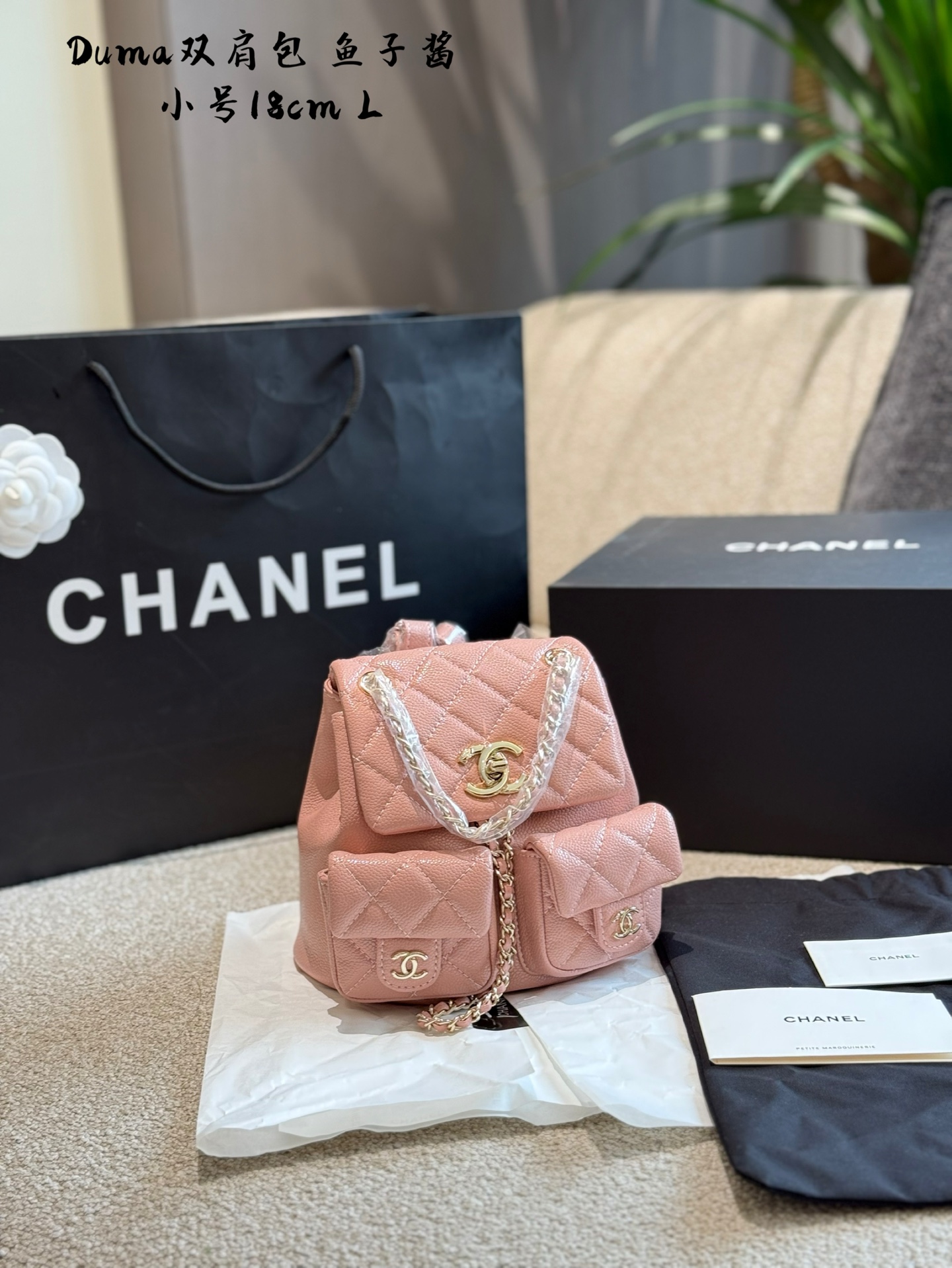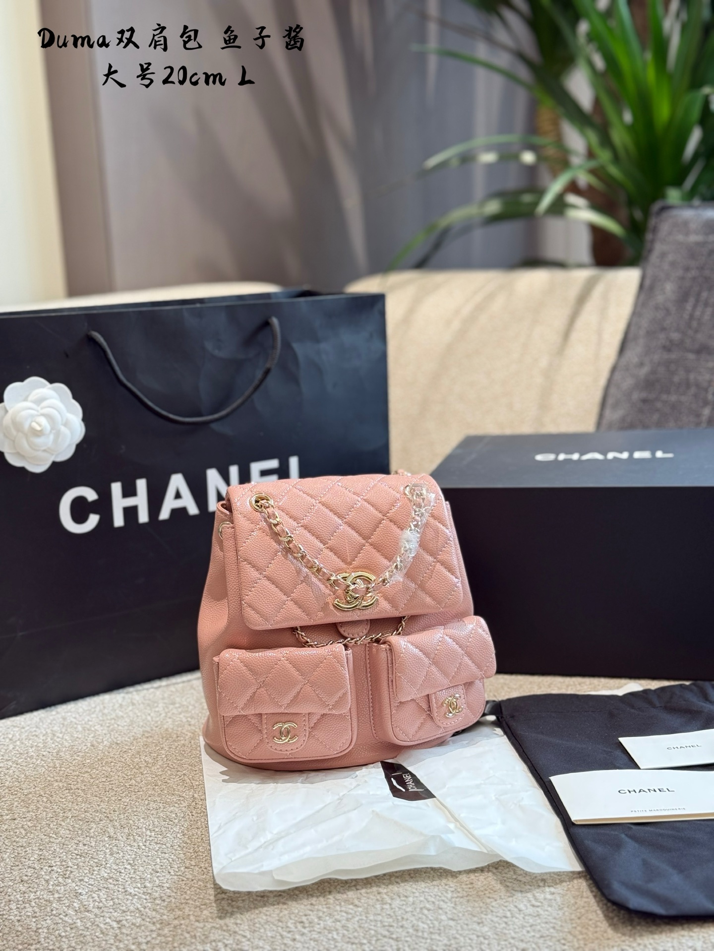💰280 鱼子酱 Chanel duma青蛙双肩包 Chanel duma青蛙双肩包由于她双口袋的在线非常可爱像两个大大的眼睛所以也叫它青蛙双肩侧面比较有型会比单口袋duma窄-些所以上身更加贴合内里是一个大空间包口的一个绳子可以收紧防盗性很好肩带一部分 是防穿链- -部分是皮质肩带还有调节扣和孔位可以随意调节长短 双肩包想当双肩包使用又不想有背书包的感觉可以选择中号165以上姐妹闭眼冲尺寸刚刚好时髦精 必备能装一袋 巴掌大的化妆袋小口袋可以装下airpods 配盒子18cm20cm