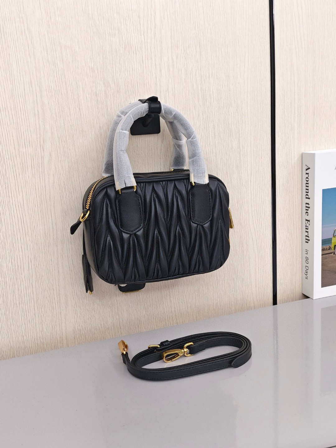 缪缪miumiu褶皱保龄球包💰260 尺寸:19×13×6cm 特点:风格优雅浪漫,材质柔软亲肤。 方式:拉链式开合,配有可拆卸长肩带,可手拎可斜挎。
