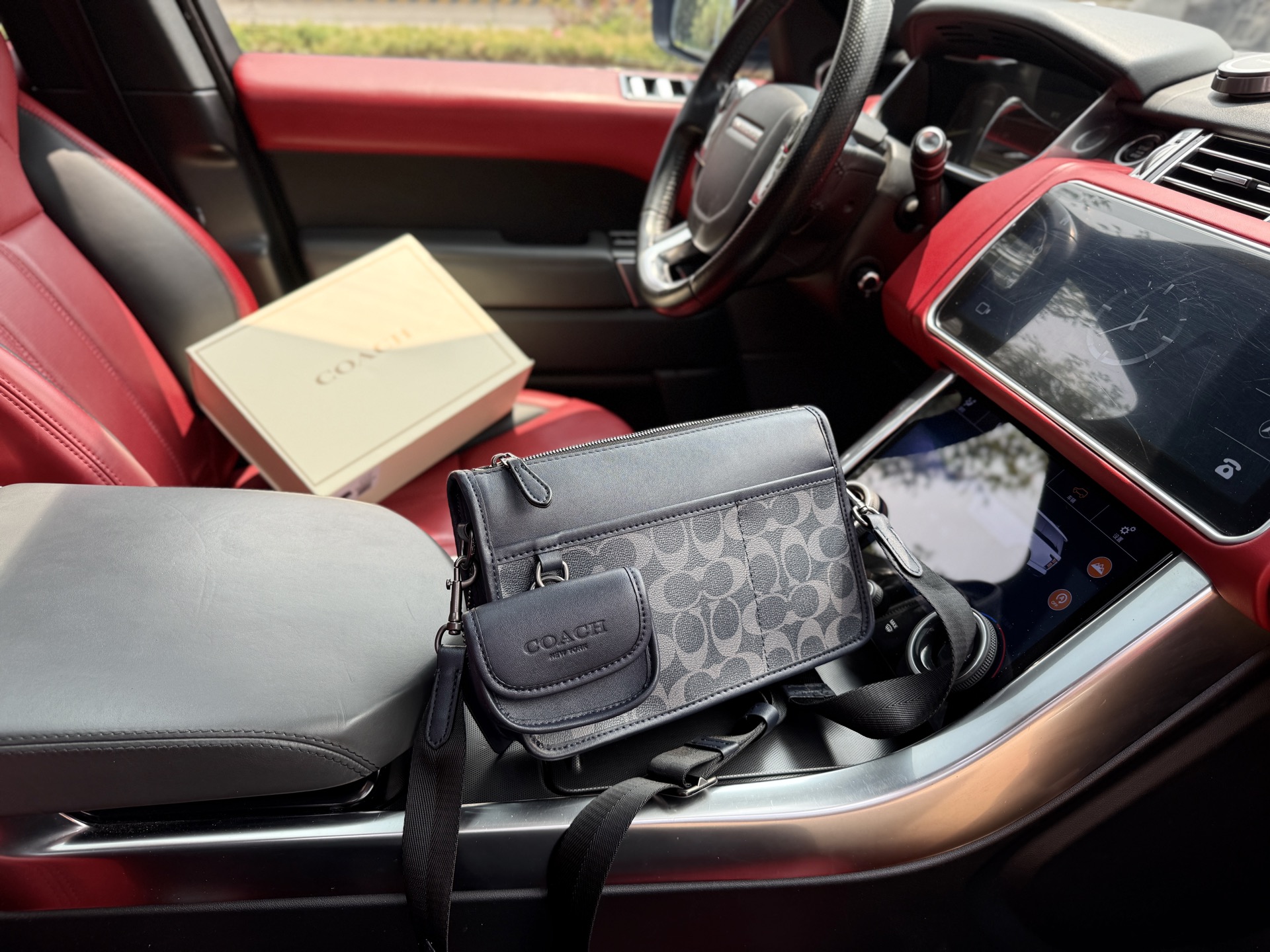 p220 📷高端货‼️ 新款 “ COACH ”蔻驰单肩包💼 coach蔻驰单肩包邮差包 COACH蔻驰 Heritage 25 经典老花印花 帆布配皮拼牛皮革 单肩斜挎包 中号 男款 蓝黑色 高清五金logo标志、专用里内里。顺滑拉链、边超平滑、做工精致每个细节到位!男人必备款。规格:25x15x5cm。配折叠礼盒🎁