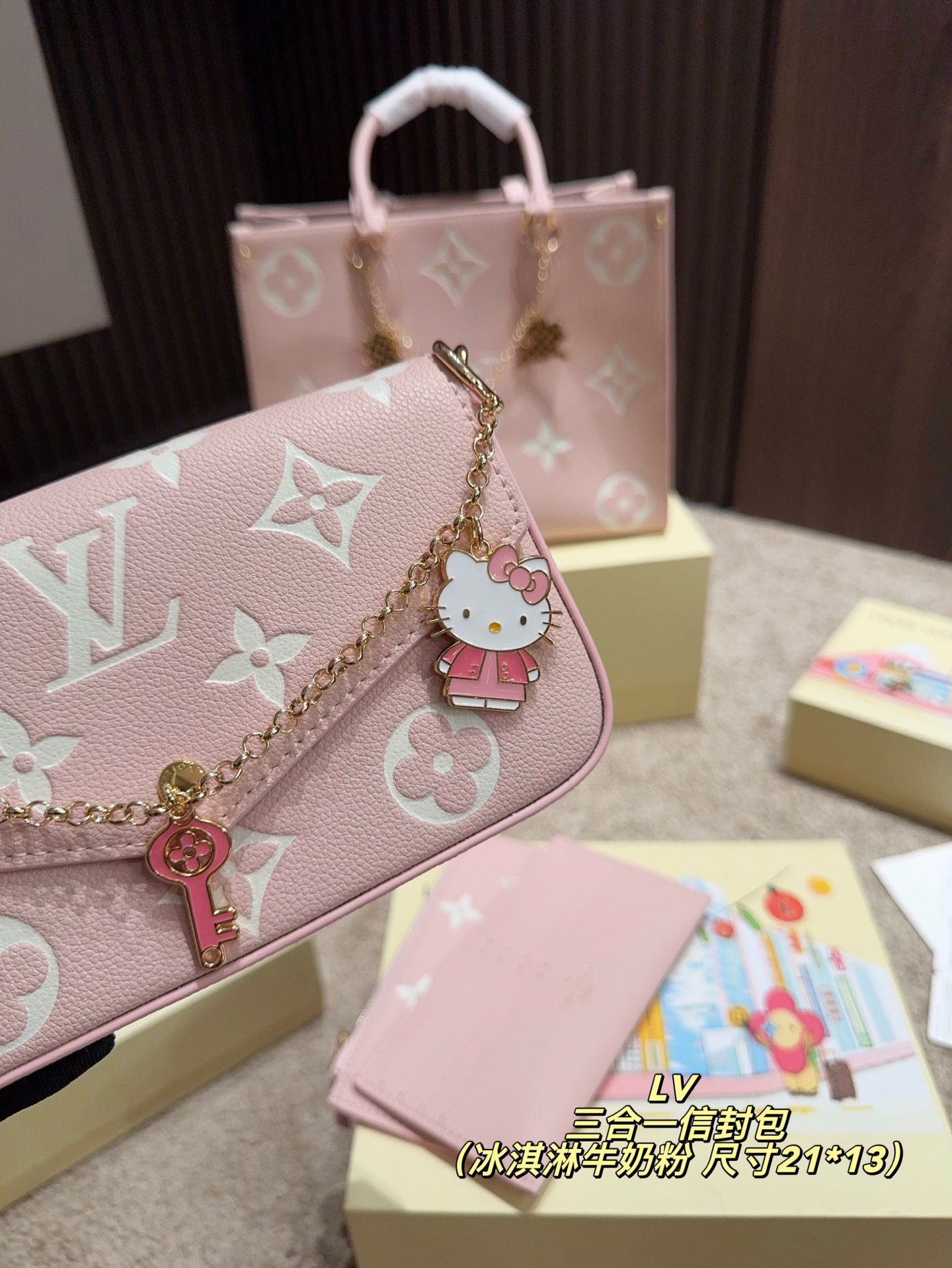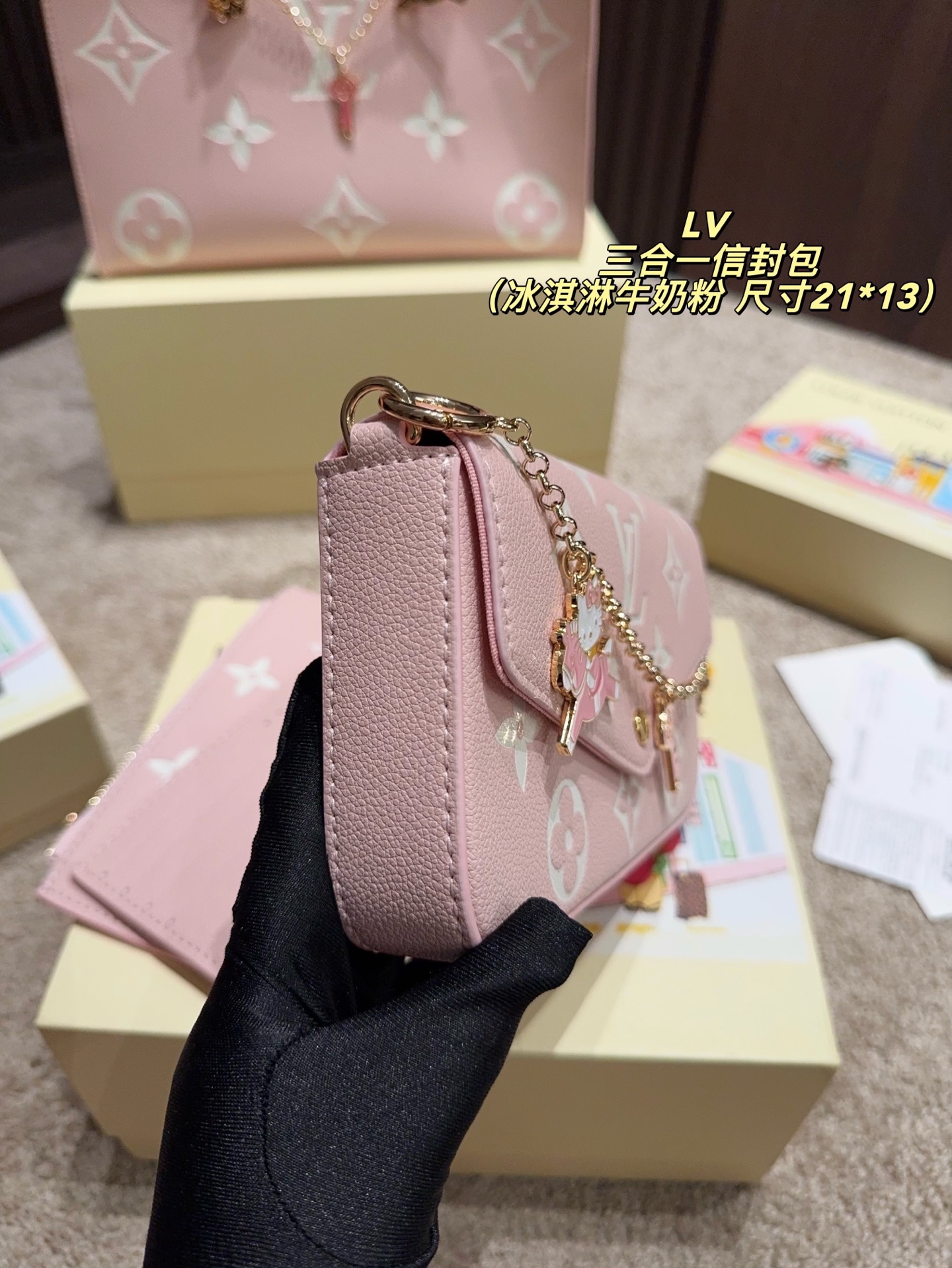 p215配盒➕挂件25⚠️尺寸21*13 lv 三合一信封包 POCHETTE FÉLICIE 可拆卸金属链条包,新品冰淇淋牛奶粉 好适合春天呐!搭配hello Kitty链条太可爱啦,买一得三的好事再次发生了 这款三合一链条包的设计真是大惊喜,手机、证件、现金、钥匙口红等日常小物都通通能容纳,重点是内里的三个配色太讨喜了