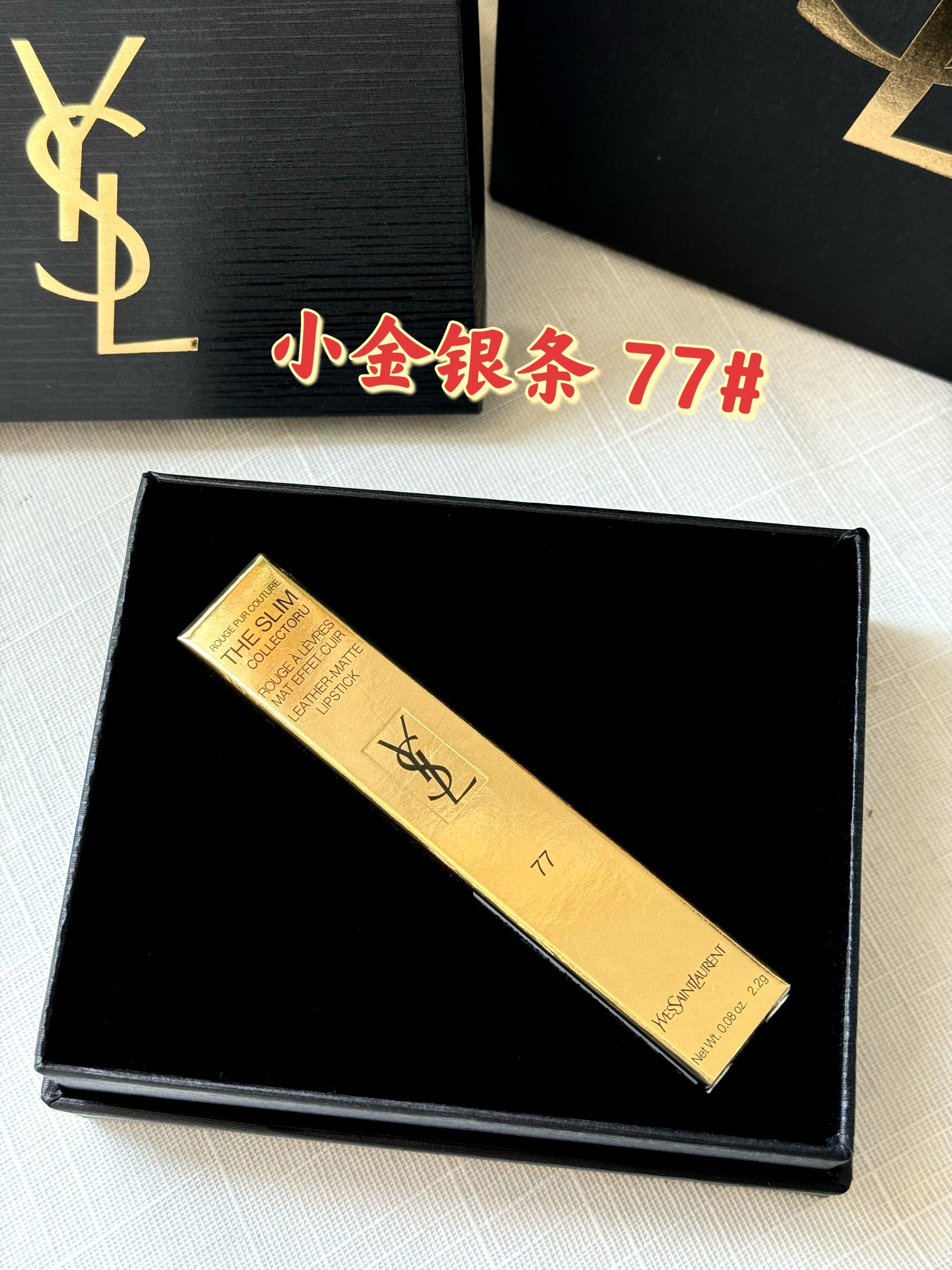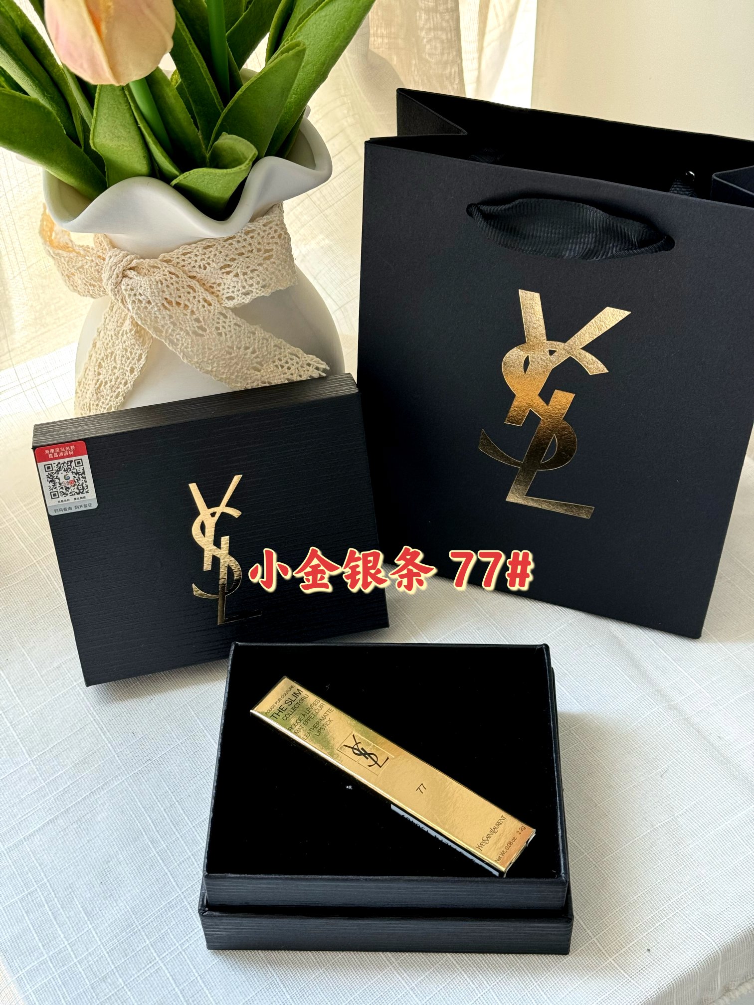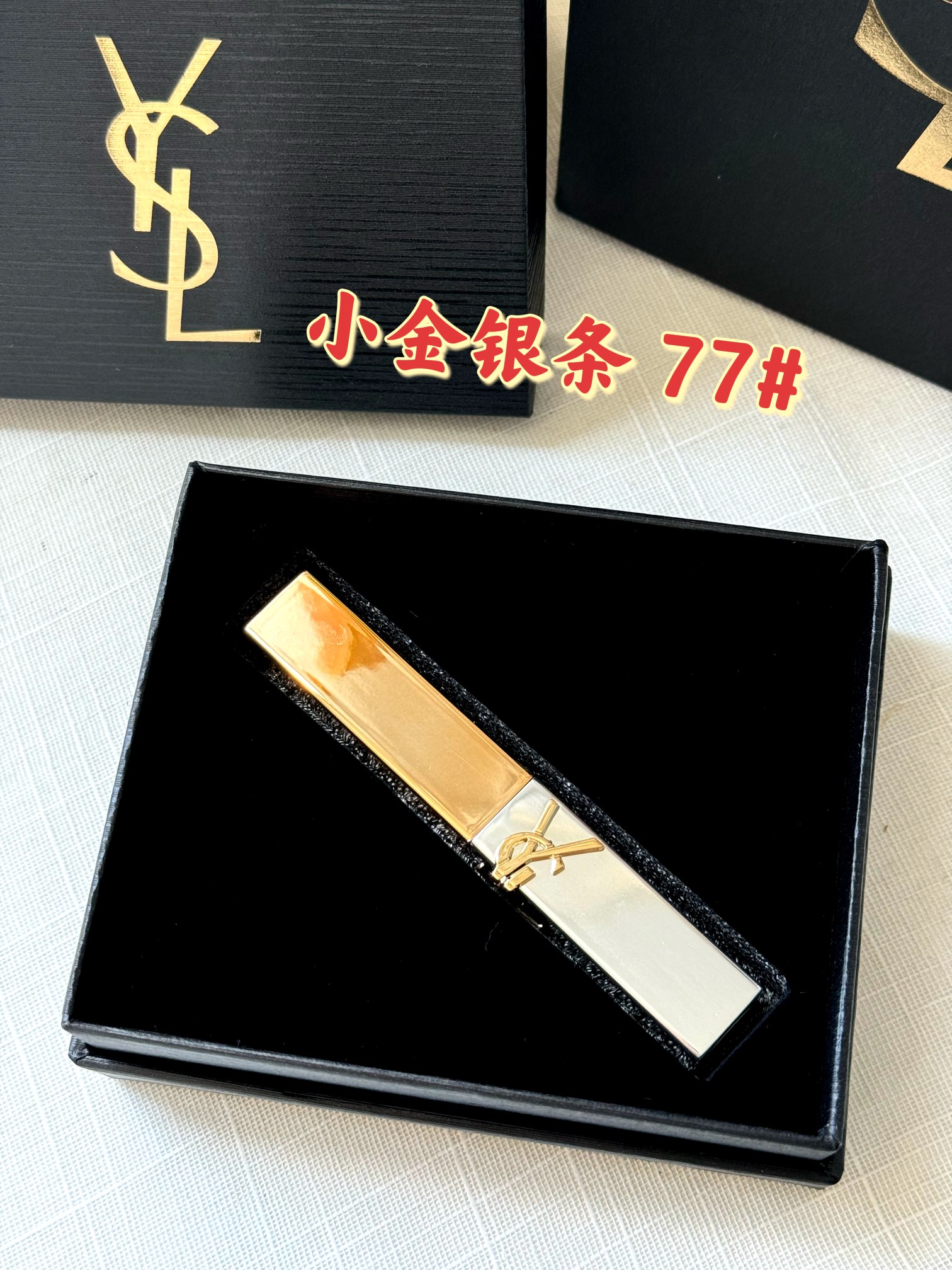 P90!世上口红千千万 只有新的最好看! YSL七夕限定浮雕小金银条77# 掌柜重磅推荐给大家!正儿八经的渠D货源!买到即是赚到!每盒都带海南离岛免税商品追溯码,并附赠海南免税城包装袋,商品追溯码刮开涂层扫码查询输入串码即可显示正规产品!! 杨树林真的太懂女生了~ 每次出的新品都美到发昏 ~ 金银碰撞的外壳高级到抓狂✨🤍 77# 烟装粉!高级感满满的木质调烟灰粉! 我命中天选的烟灰粉终于找到了!! 薄涂一层巨日常又慵懒,嫩呼呼的杏粉色好温柔 ~ 厚涂就增添了一丝清冷灰调,冷烟灰和暖雾粉融合真的好city! 时髦气质感咱妥妥拿捏了!高饱和低明度很适合亚洲女生!黄皮闭眼入!显得妆面都很干净通透!! ⚠️口红不支持涂抹试用❗️不支持‼️影响到二次销售不退不换❗️敬请谅解‼️‼️