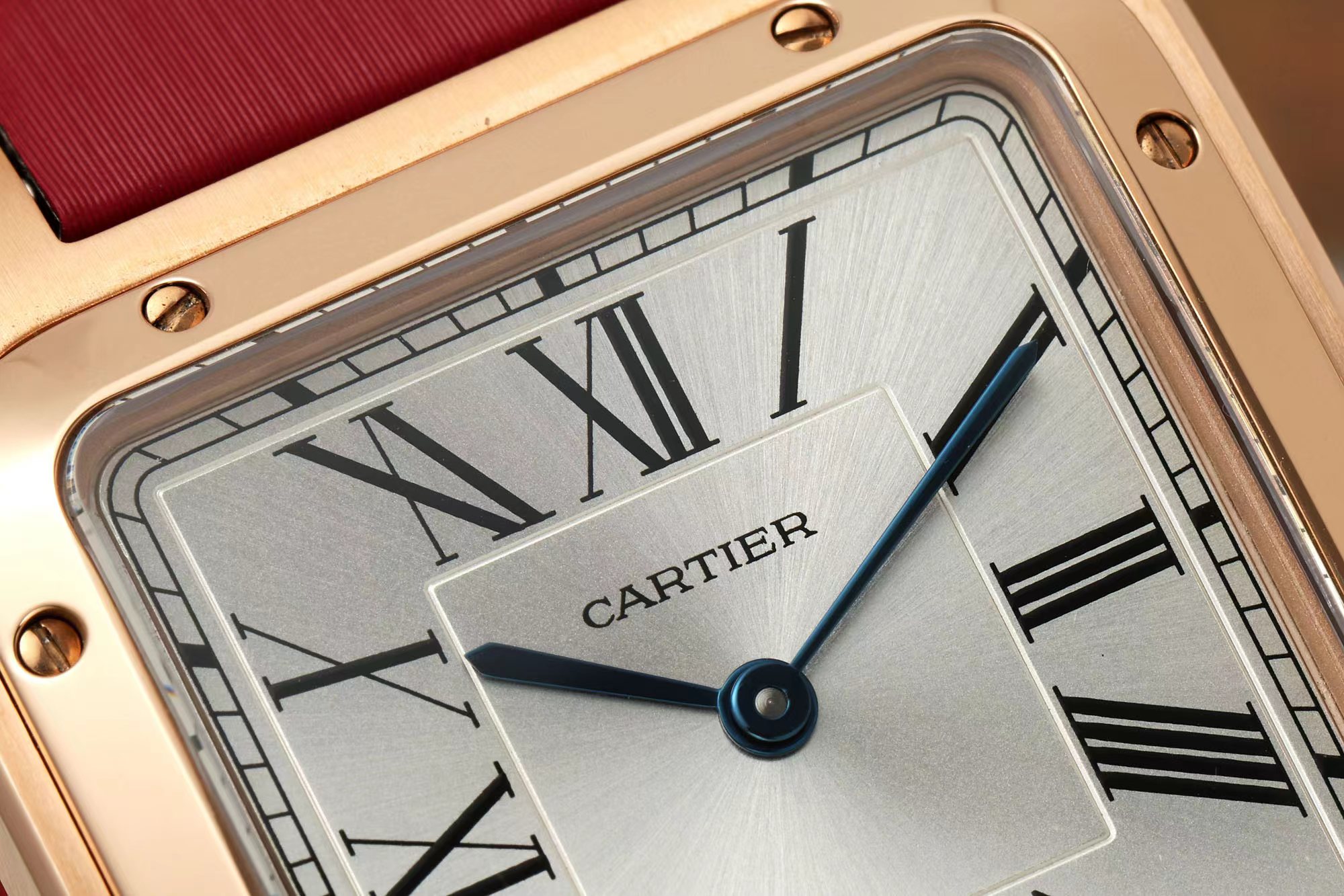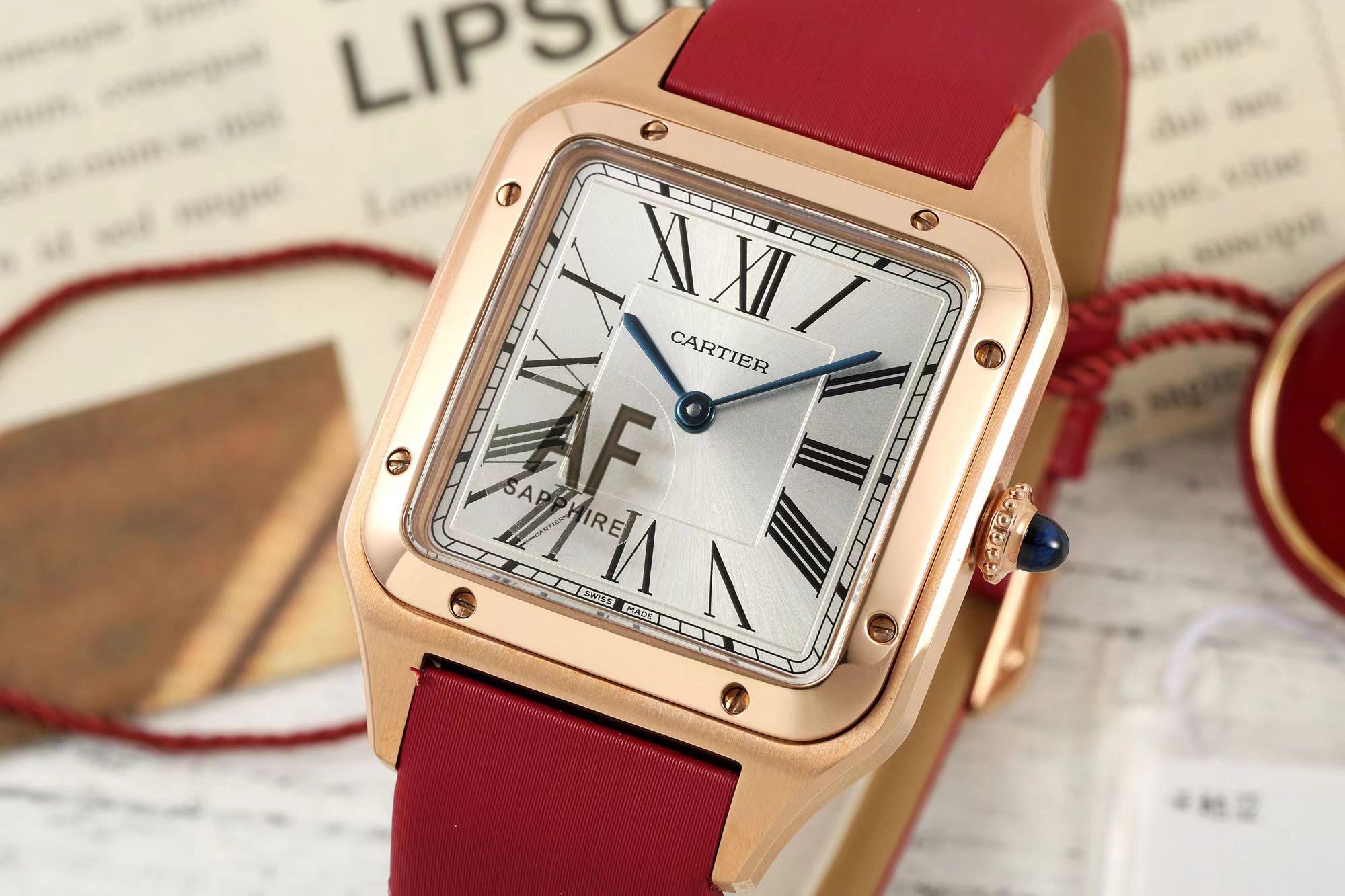 AF卡地亚山度士腕表,成熟魅力之典范 【表壳】尺寸27.5X38MM精钢表壳,延续经典方形设计,拉丝工艺勾勒出硬朗线条。圆珠形表冠,镶嵌一颗凸圆形蓝色合成尖晶石 【表盘】镀银磨砂表盘,阳光射线纹饰效果,罗马数字时标,剑形蓝钢指针,蓝宝石水晶镜面 【机芯】媲美原装的高效率石英机芯,超长续航时间 【表带】多色鳄鱼皮表带,精钢针扣式表扣。和原装一致的表带快拆系统。 AF山度士以不断创新的理念和巧夺天工的设计,书写世界珠宝及腕表设计制作的历史