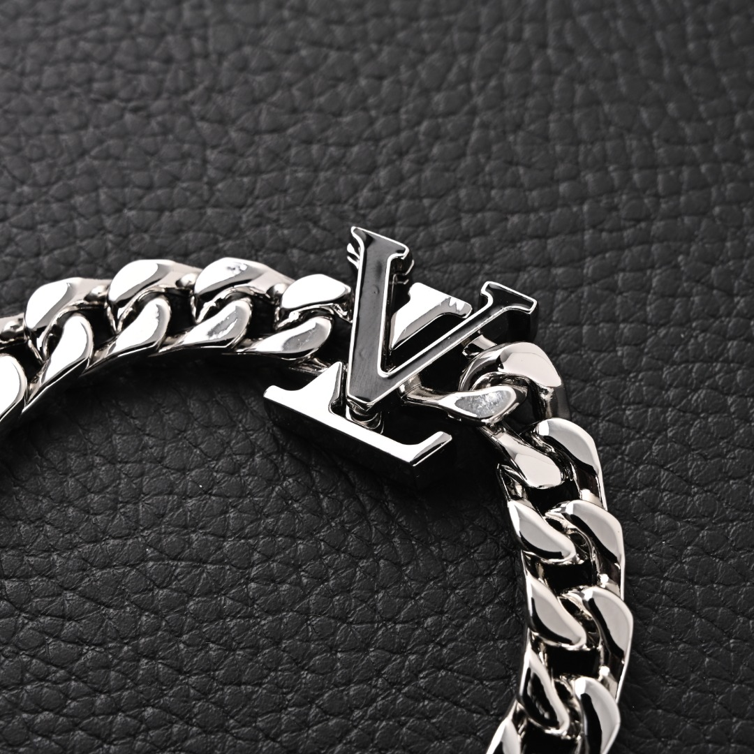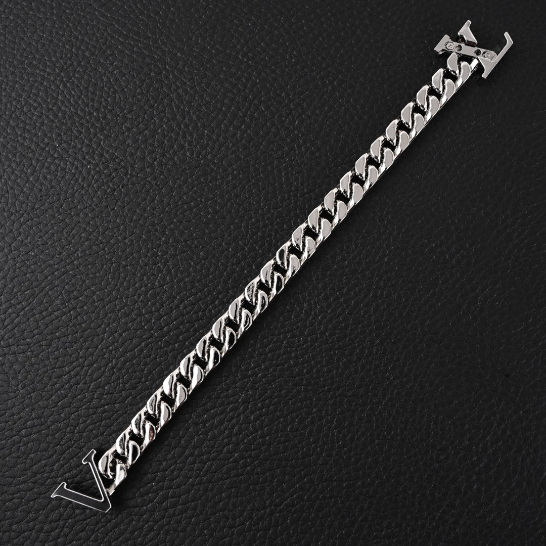 LOUIS VUITTON/路易威登LV 王鹤棣同款 黑色珐琅古巴银色手链 注意:防伪扣拆除不退换! 配:专柜全套包装(如图👇) LV SPIKE 手链是路易威登(Louis Vuitton)推出的一款时尚珠宝,属于LV的Spike系列。该系列以其独特的设计和精致的工艺而闻名,通常结合了金属和LV标志性的元素,展现出奢华与现代感。LV SPIKE 项链-编码:M01382-官网在售价¥8,700RMB,LV Spike 项链出自路易威登崭新男士珠宝系列,以 钛钢塑造粗犷链条,再为工致固定链融入珐琅 LV 钩扣,成就日常造型的摩登之选。 材质:钛钢 尺寸:22cm
