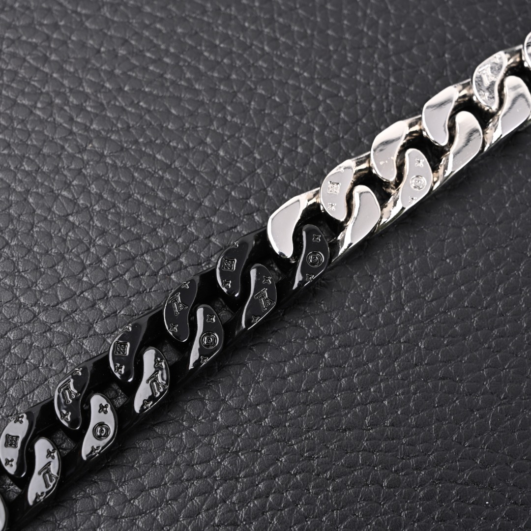 Louis Vuitton LV路易威登 Chain Links 手链 包装:如图所示 盒子、布袋、礼品袋 材质:钢 此款 LV Chain Links 项链工致镂刻袖珍 Monogram 图案,样式精巧,呈现两种摩登饰面,链条处刻有细小的 Monogram 图案,再为牢靠的钩扣抒写品牌经典元素,于细节之处彰显精湛工艺。 详细特征 金属饰件 PVD 涂层 镂刻 Monogram 图案 钩扣