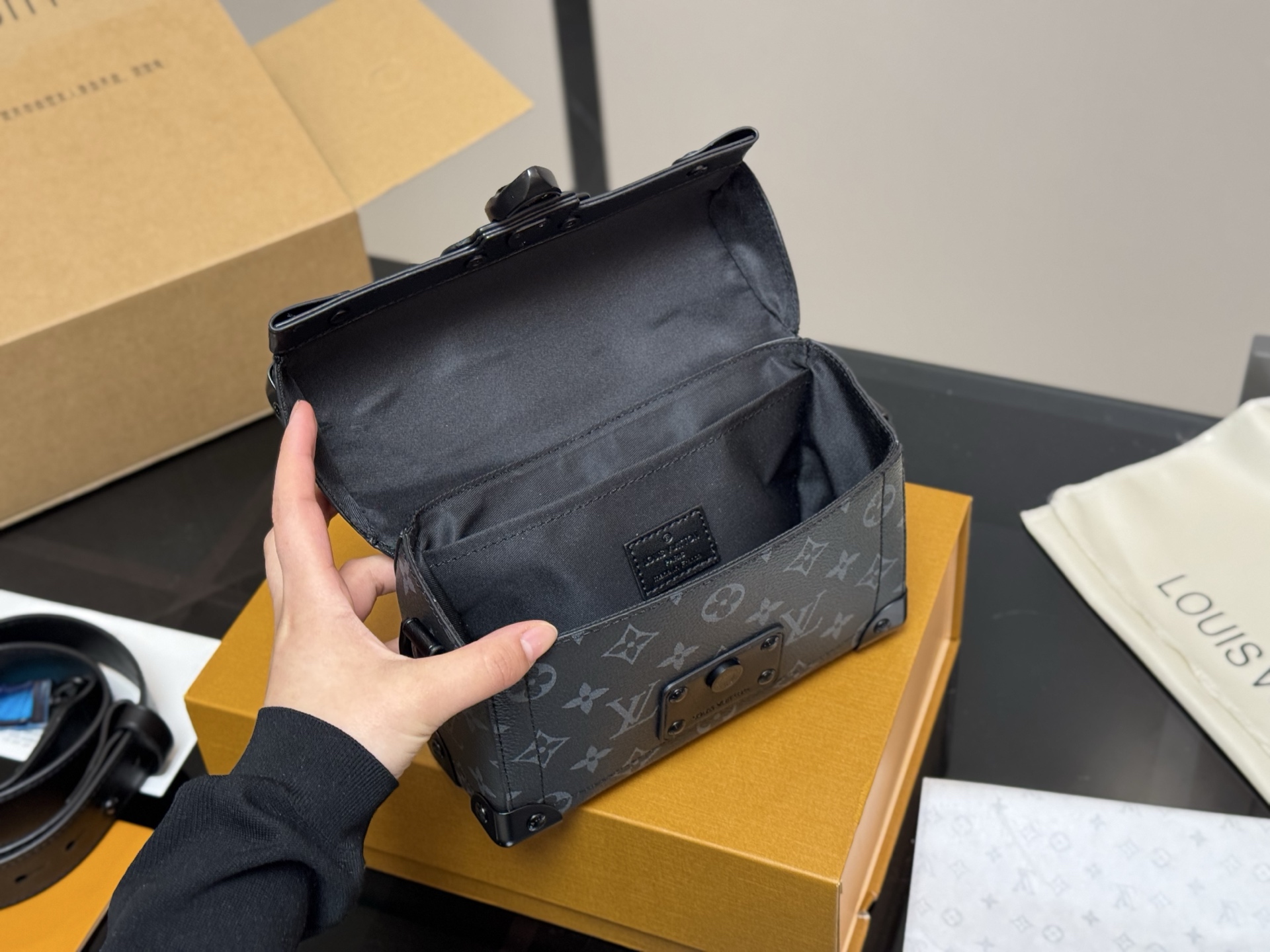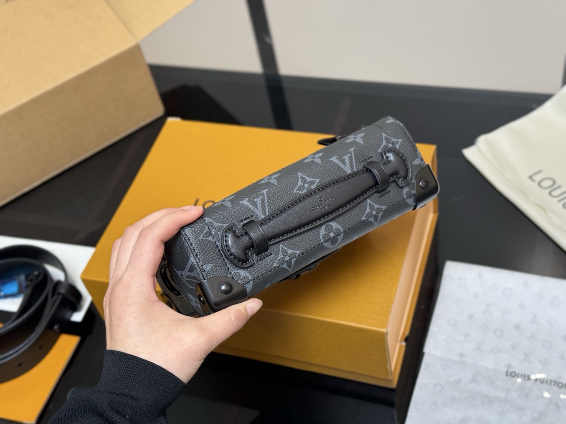 ¥310 配折叠盒飞机盒 尺寸:20.14cm LV 盒子包 真的是可爱的方盒子 调调很色喜庆! 真的是小可爱! MINI SOFT TRUNK盒子包 细节超OK👍