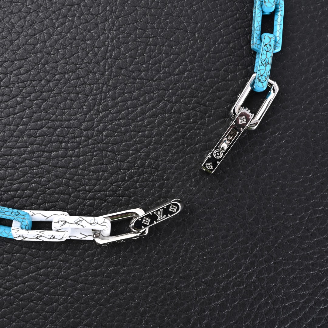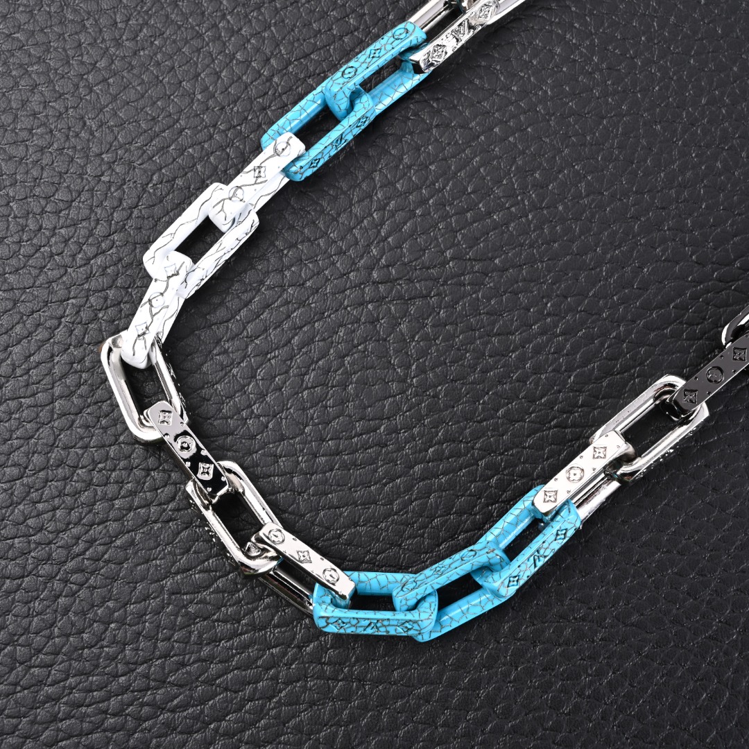 LOUIS VUITTON LV MONOGRAM CHAIN 大理石花纹竹节项链M01293 官网在售价¥8,200RMB,本款 Monogram Chain 项链展现繁复设计和工业美学的融合。粗犷精钢链环渲染摩登色彩,交替呈现雾面和沙砾纹理。每只链环的 Monogram 铭纹再添经典元素。精钢-镂刻标识-意大利制造!配专柜全套包装 Size:52cm