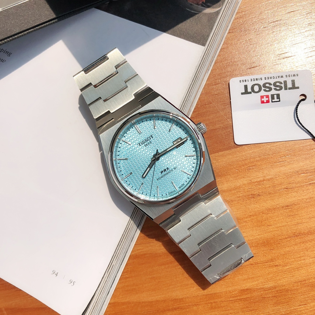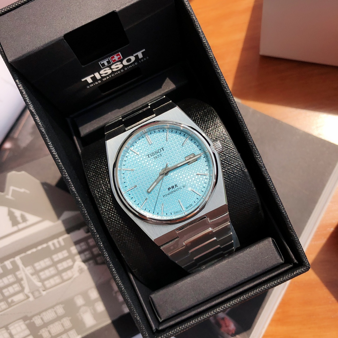 天梭表推出全新PRX Powermatic 80冰蓝色腕表,进口瑞士机械机芯,超强夜光,开关生耳,蓝宝石玻璃,直径40毫米,厚度10.8毫米。表壳采用源自1970年代的标志性一体式设计,以精钢打造,经过拉丝和抛光润饰,配备蓝宝石水晶镜面和透视表背,具有100米防水性能,配全套包装出