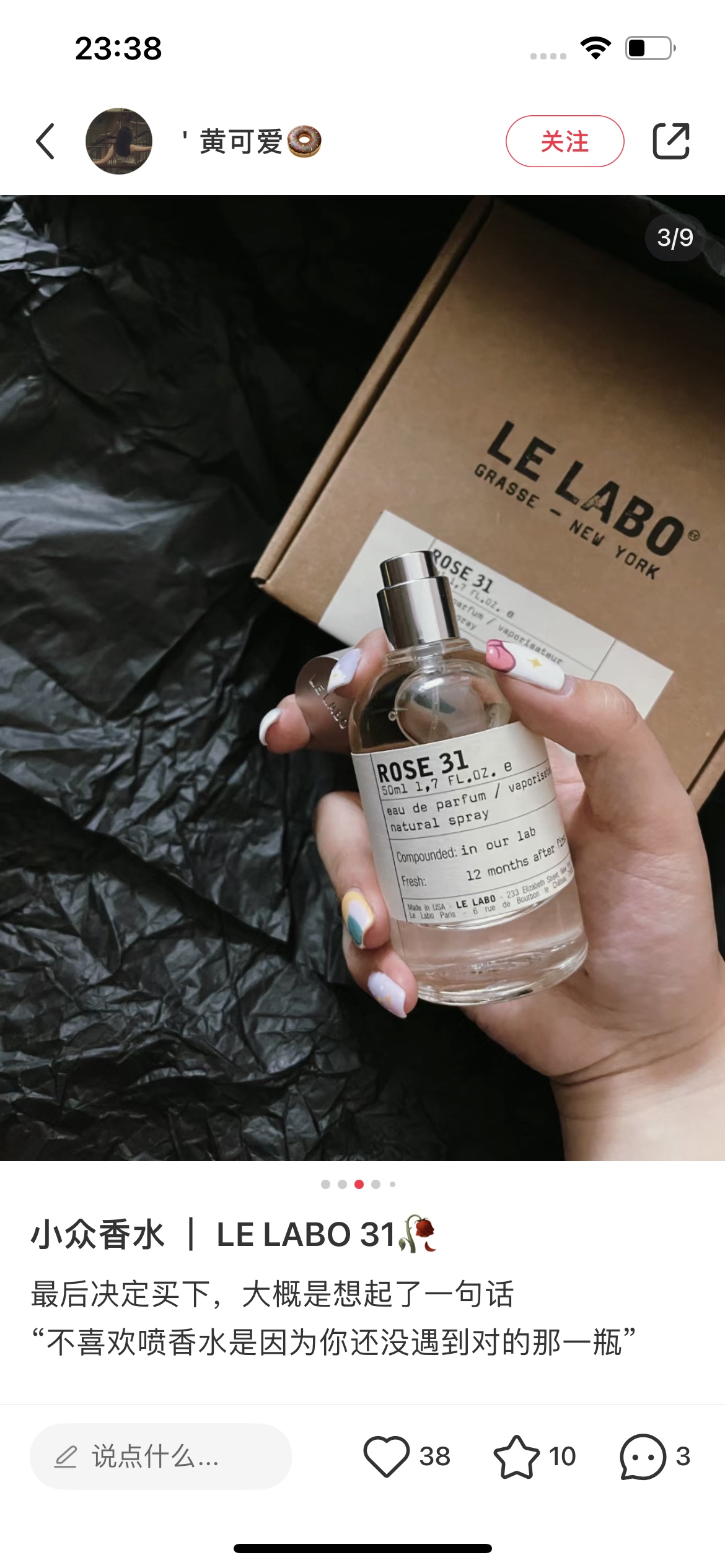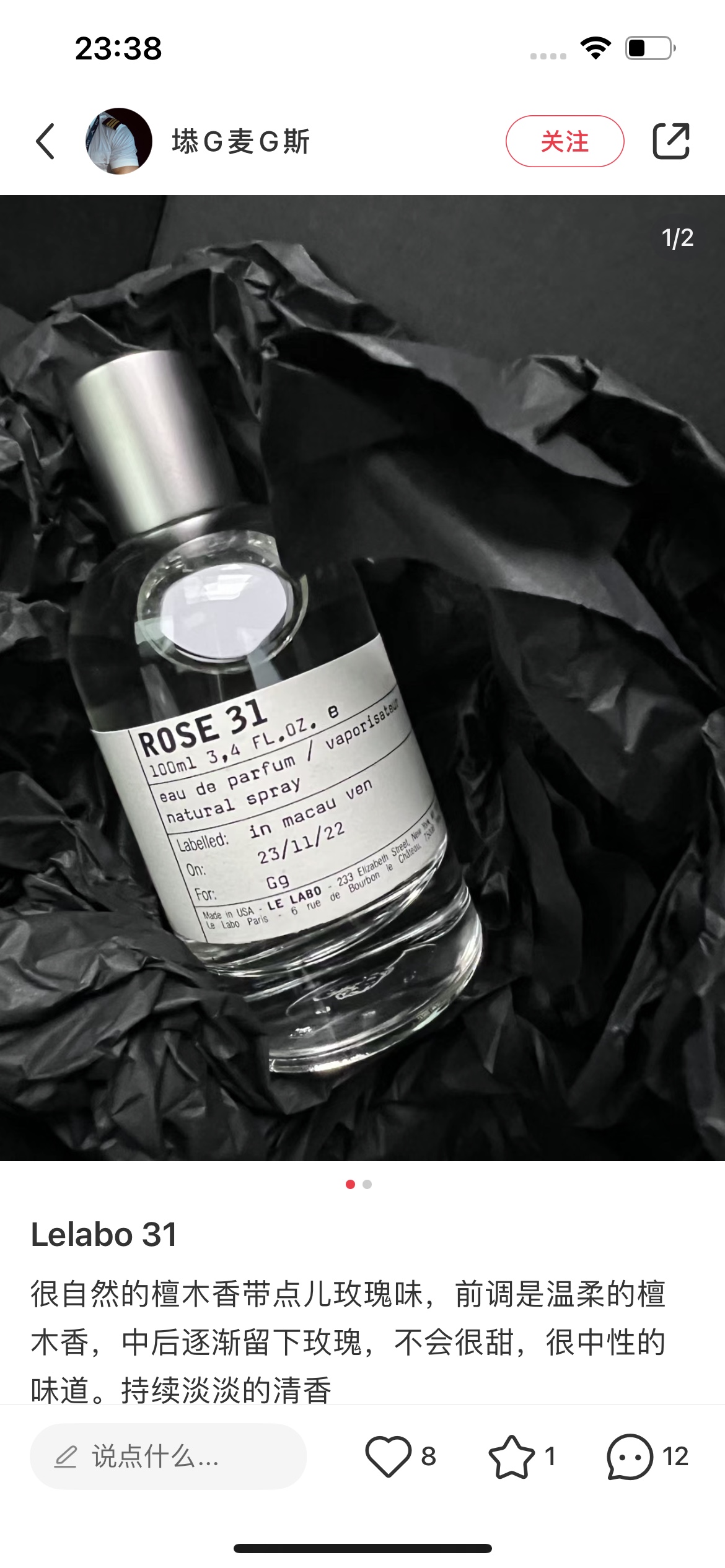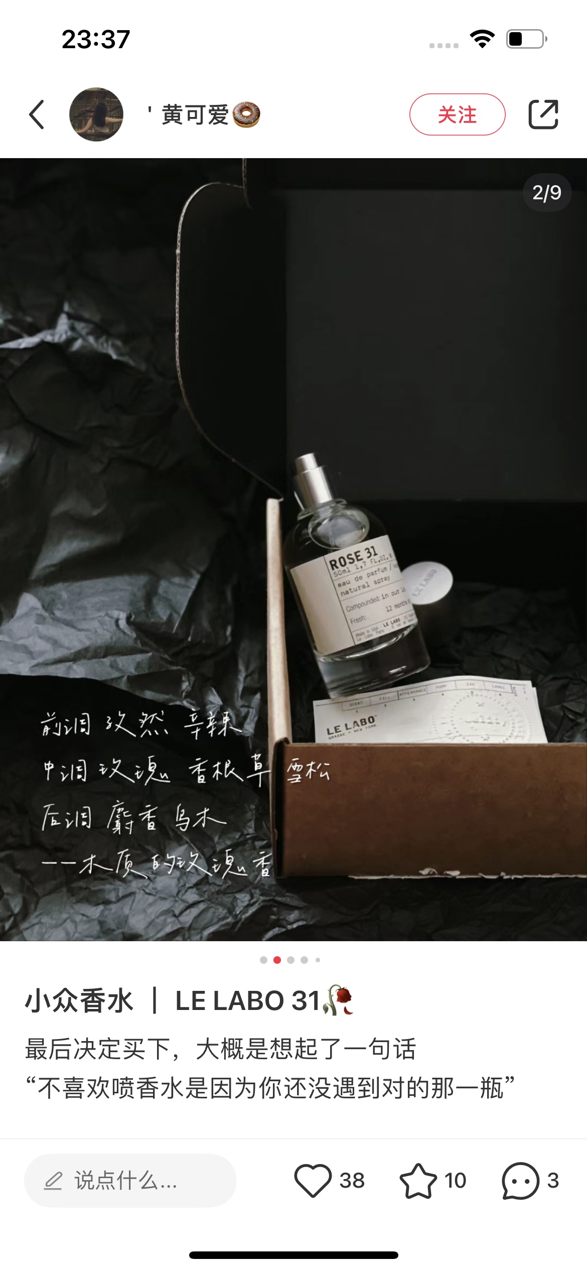 香水实验室31号:玫瑰这个元素在roes31强调的是娇艳而非清润,是具象的玫瑰花味,混合上各种低沉的干木香和似有若无幽幽的乳香就很有“富江”的形象,虽然我没看过富江这部动漫吼,但这支香强调的更多是富江的相貌给人的感觉rose31越往后调走就越给人一种真人“富江香”,高级公主切,病娇柔骨美的同时,又有幼态的“腹黑”感,是像“妖jing”一般的存在,非常特别的一种美。