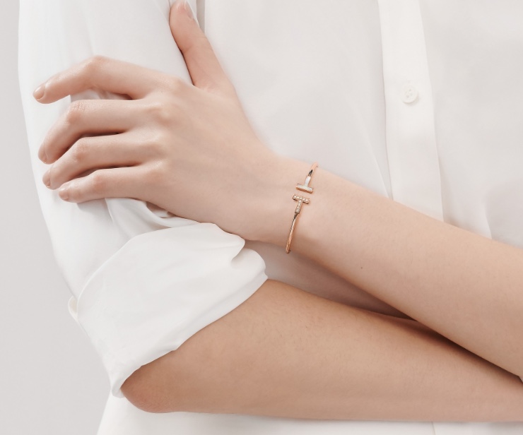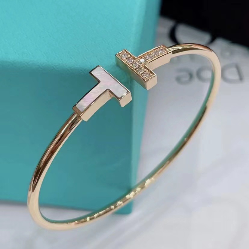 💰90 💕蒂芙尼💕双T手镯18K 玫瑰金镶嵌钻石和珍珠母贝 ,此款手镯镶嵌彩虹光泽的珍珠母贝,设计时尚,更添精致。莹润珍珠母贝搭配闪耀华美钻石,设计大胆、光彩耀目、典雅迷人。