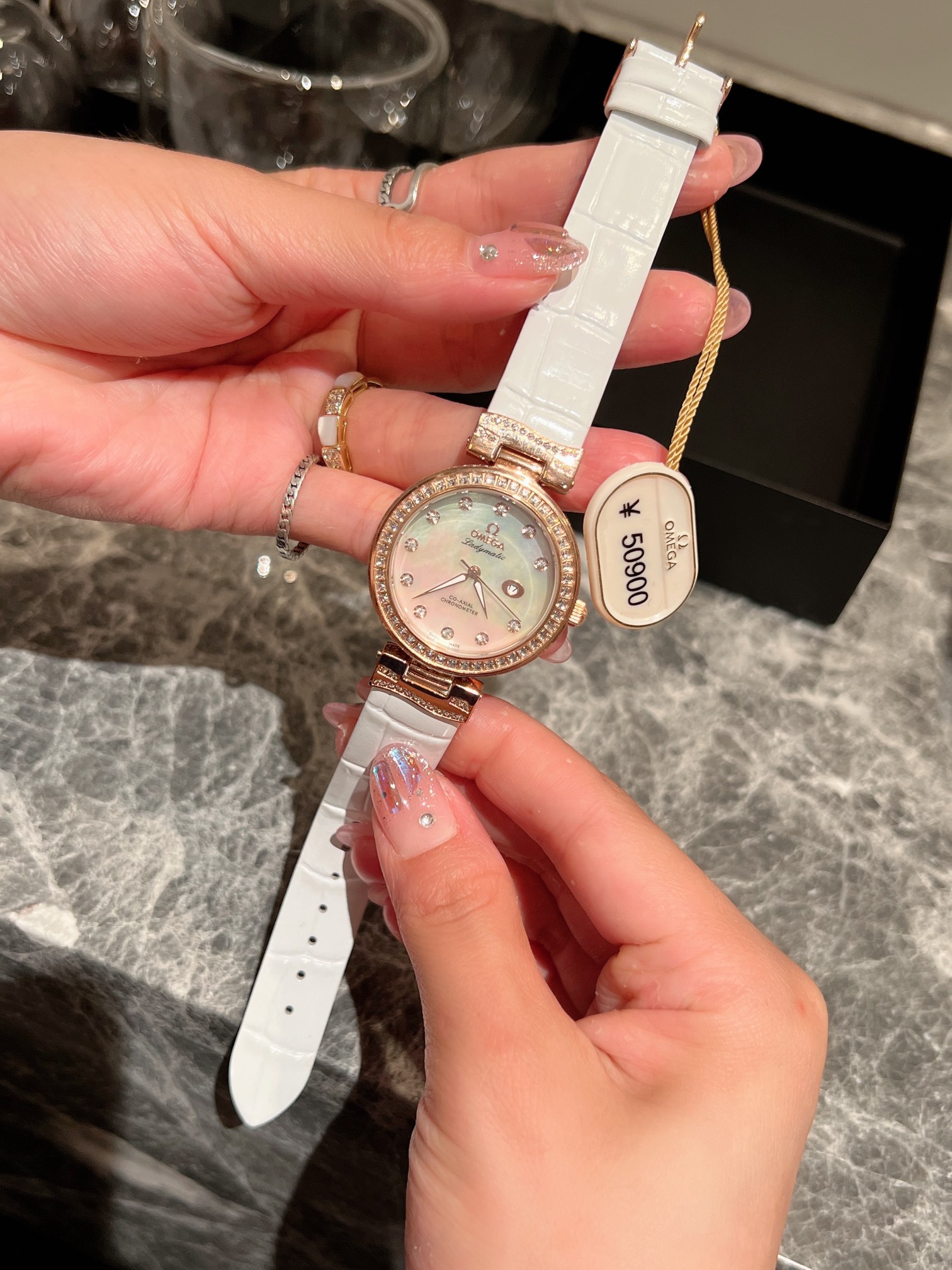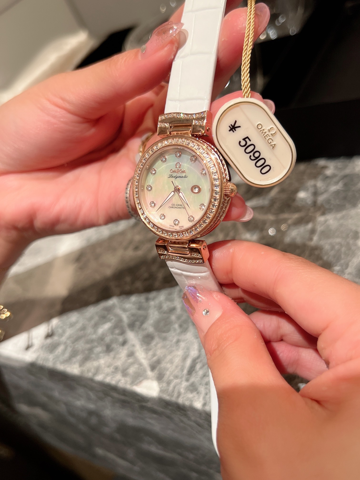 💰390全新欧米茄蝶飞系列腕表#表壳由精钢和施华洛世奇真钻制成,表盘采用垂直拉丝工艺,表圈使用2*2方石施华洛世奇钻,表壳侧边点缀颗颗闪烁的真钻施华洛钻石,呈现出迷人的太阳射线打磨效果,在璀璨钻石时标的点缀下,更显格调。珍珠贝表面与小牛皮表带完美搭配
