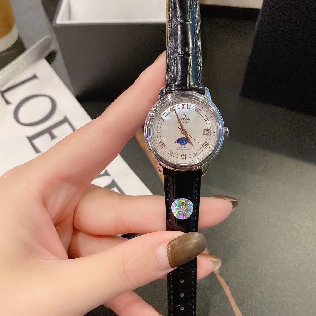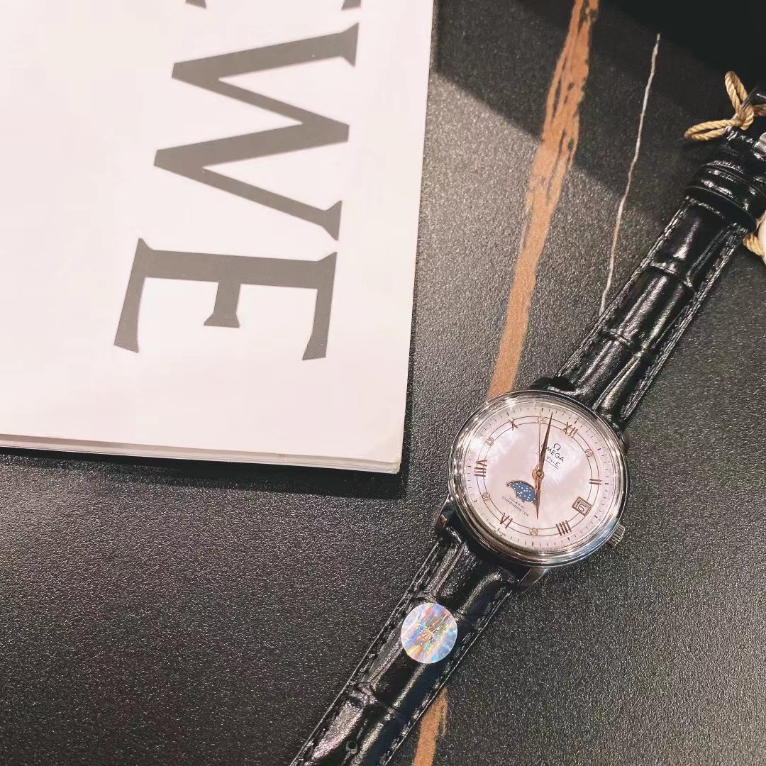 💰390 欧米茄蝶飞系列星辰月相腕表采用直径为33mm的精钢表壳,搭配鳄鱼皮纹表带,佩戴起来非常舒适。表盘选用丝绸纹理和珍珠母贝两种与钻石💎时标交相辉映,表盘3点钟位置设有日期指针,6点钟位置设有月相显示🌝🌗🌖,蓝宝石防滑镜面,整体效果简直太哇塞了