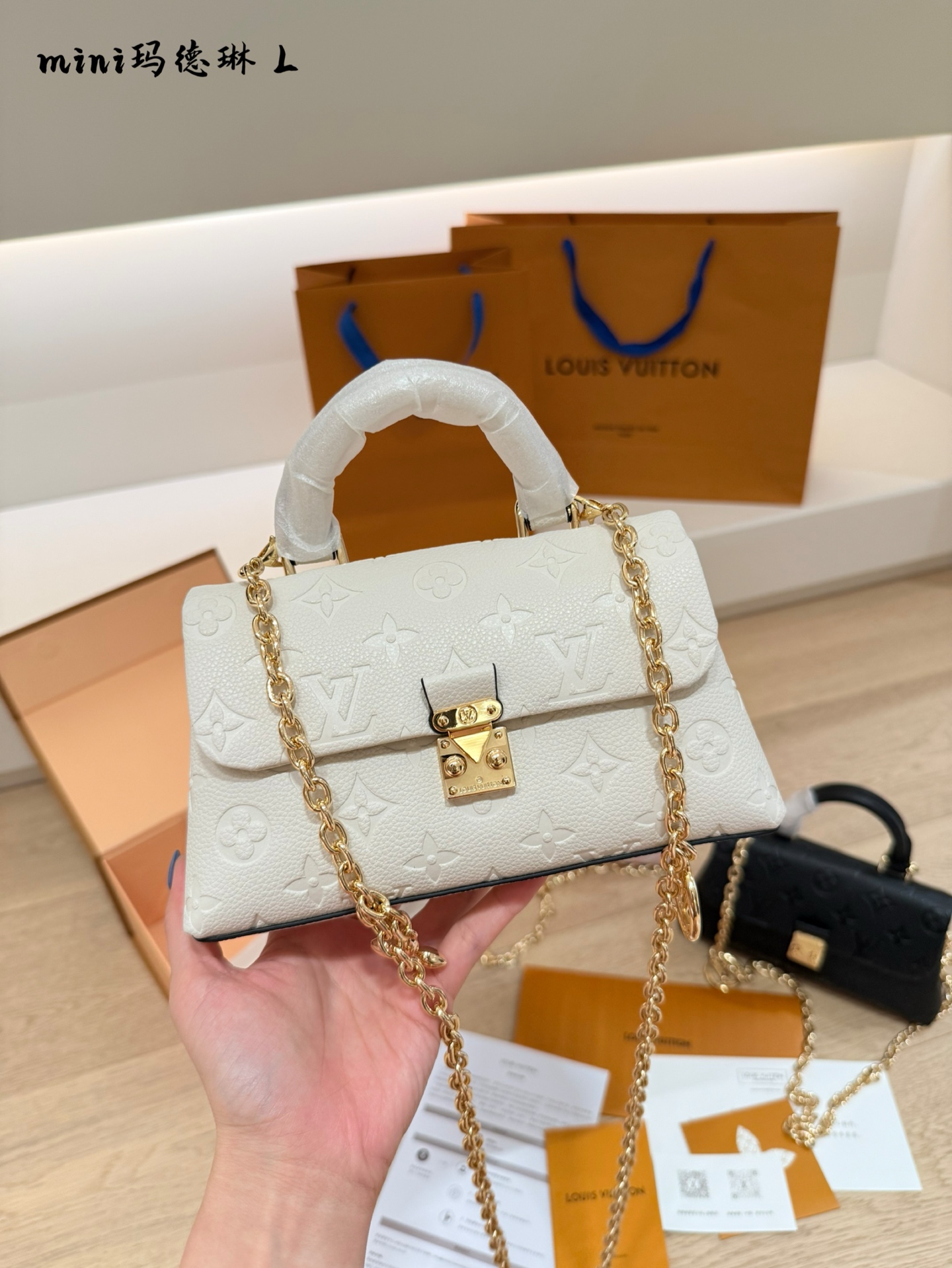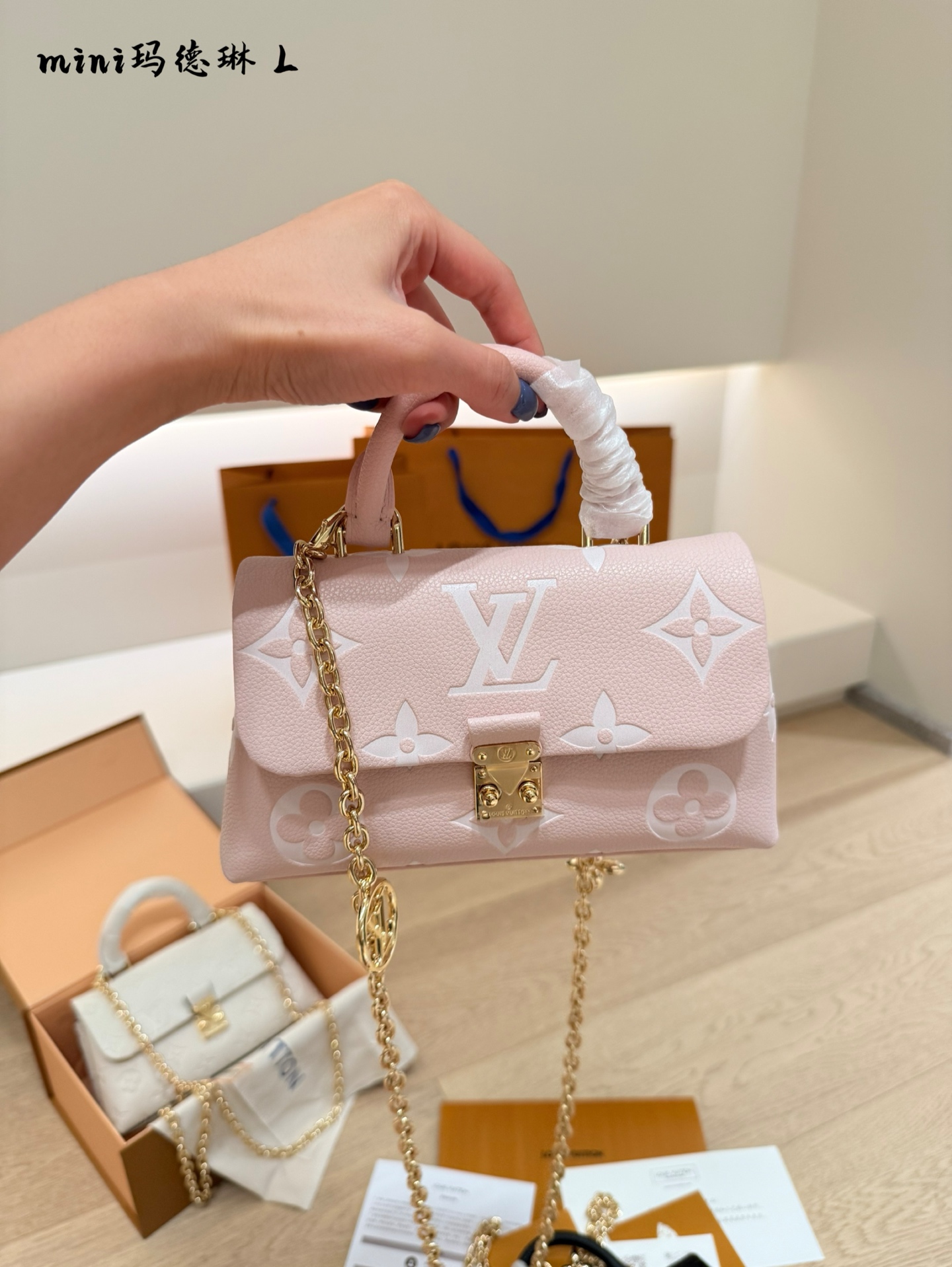 💰280 LV Madeleine Nano手袋 LV Madeleine Nano手袋,采用Monogram Empreinte 压纹牛皮,质感满分!金色S-lock锁扣+ 可调节链条肩带,手提斜挎都OK+。别看它小巧,手机、口红、钥匙都能装下,日常出门超方便!。时髦又实用,出街必备!20cm配盒子