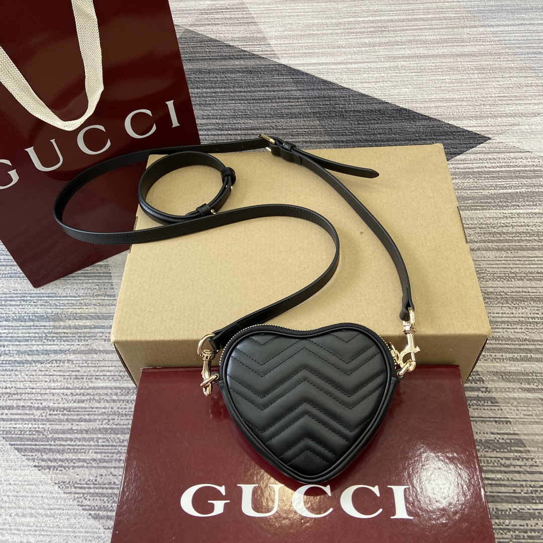 配全套专柜包装】‼️这款GG Marmont系列迷你手袋采用俏皮可爱的心形廓形,以柔软的黑色V型Matelassé牛皮革匠心打造。包身造型简洁小巧,配以浅金色调标志性双G配件。 重量:约0.162千克 型号:837753。 尺寸:13.5厘米(宽)x 11.5厘米(高)x 2.5厘米(深) 颜色:黑色/原厂皮。 意大利创作