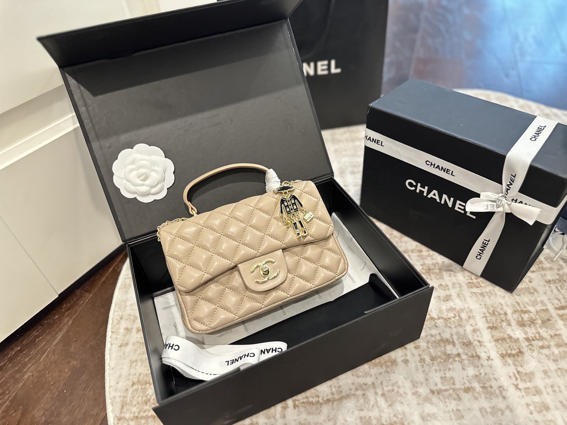 💰260 礼盒包装 Chanel 手柄mini cf handle 手柄款cf款式一直以来都是百看不腻的🥰 这季度在经典cf handle基础上搭配了皮穿链手柄 经典minicf的大小,容量感人👌🏻,pro max粉饼口红钥匙都能放得下 浅金扣双C五金,菱格纹饱满,链条长度也合适👍🏻 手柄很精致,中间带有一个经典的双C小logo,感觉有点小俏皮 尺寸:20*12*6cm