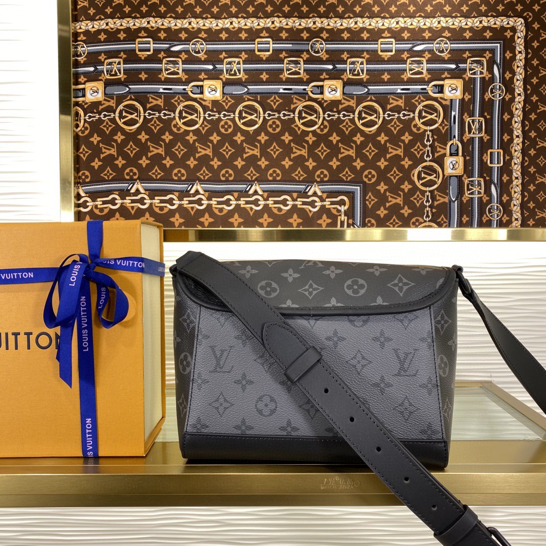 顶级原单 65558853 m12681 银花 本款 Pulse 邮差包以 Monogram Eclipse 帆布塑造精巧构型,为翻盖上的外袋搭配线绳拉链头。磁扣开合方便取放物品,巧用侧环调节皮革肩带,肩背斜挎两相宜。 尺寸:17 x 11 x 26.6 厘米。