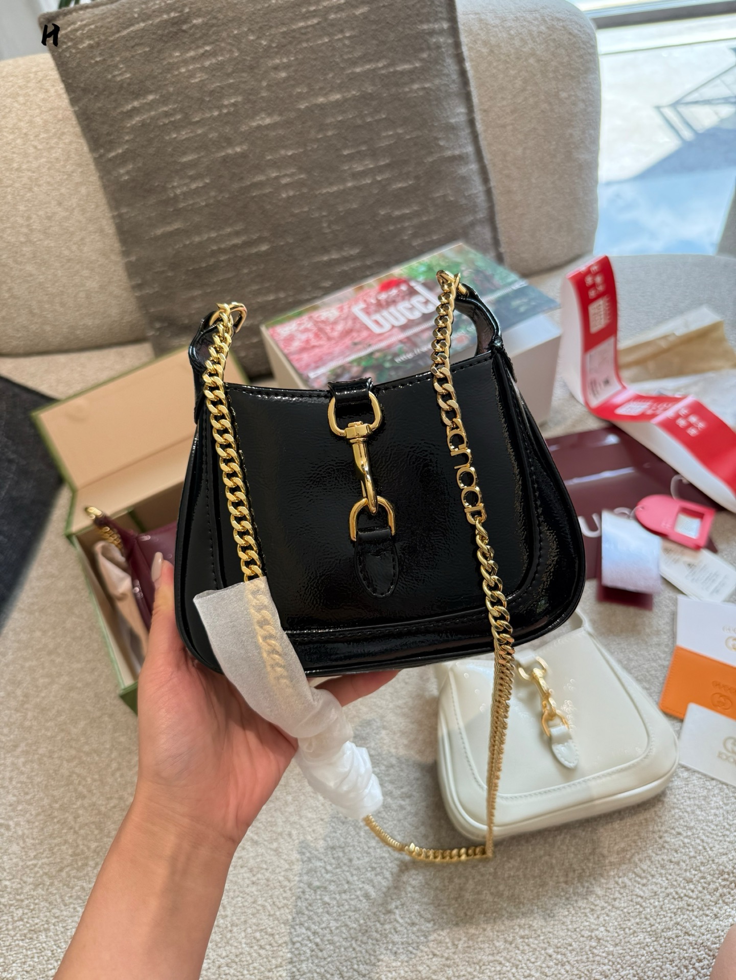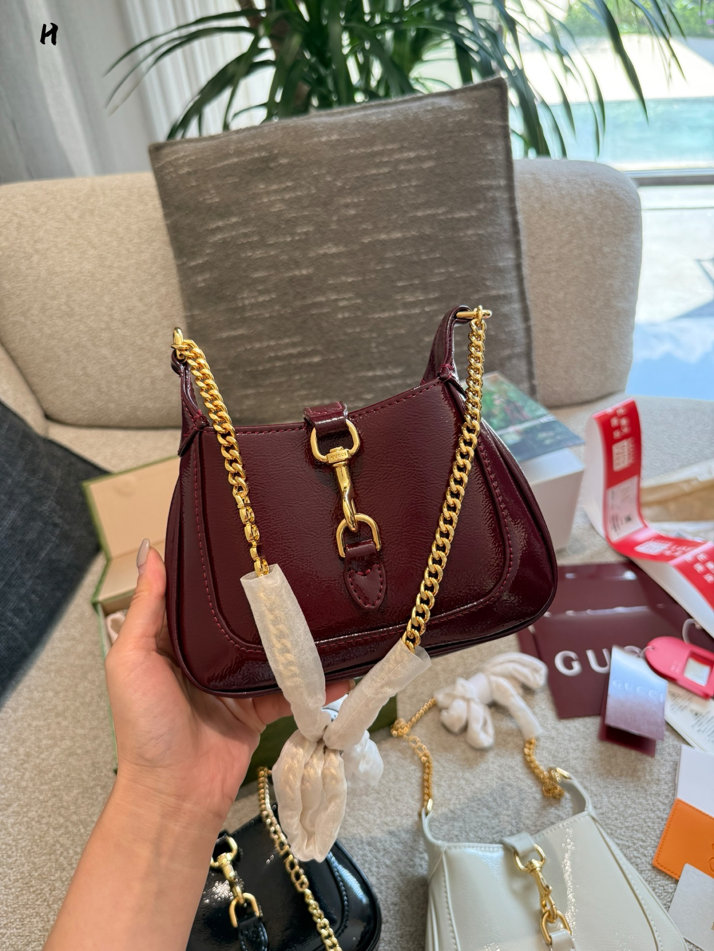 Gucci油蜡皮💰300 古奇Jackie 1961 全新JackieNotte手袋由品牌创作总监SabatoDe Sarno设计。它生动展现了品牌经典Jackie系列的自信底蕴,精心糅合全新廓形和精致细节,成就晚间造型的理想配饰。红色漆皮、钩扣开合搭配浅金色调字母链带,赋予这款迷你肩背包别具一格的时尚感。红色漆 皮,金色调配件。尺寸: 19x18x3.5cm