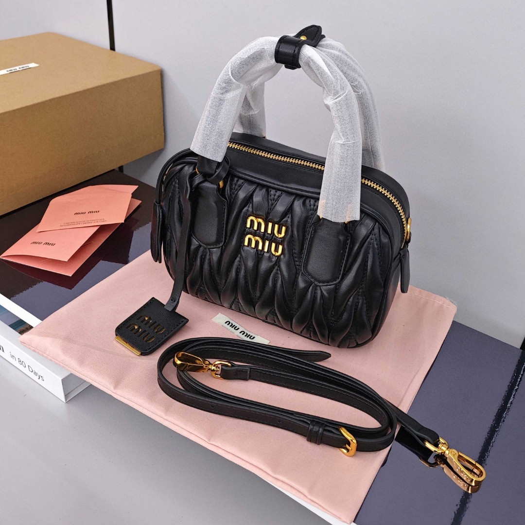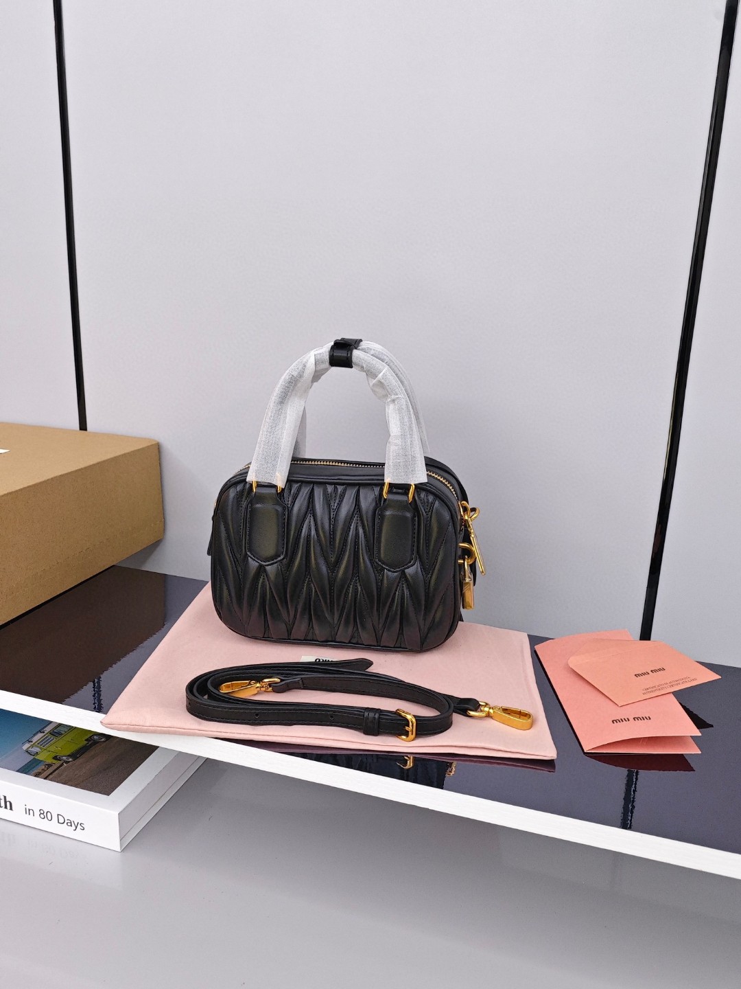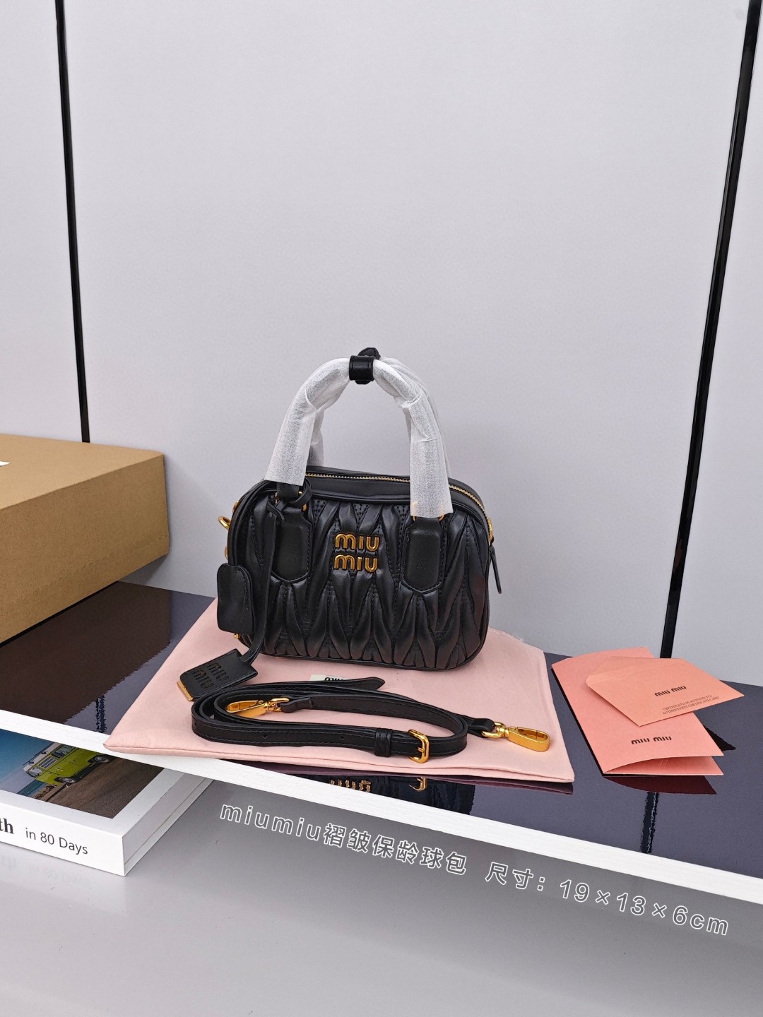 miumiu褶皱保龄球包💰260 尺寸:19×13×6cm 特点:风格优雅浪漫,材质柔软亲肤。 方式:拉链式开合,配有可拆卸长肩带,可手拎可斜挎。