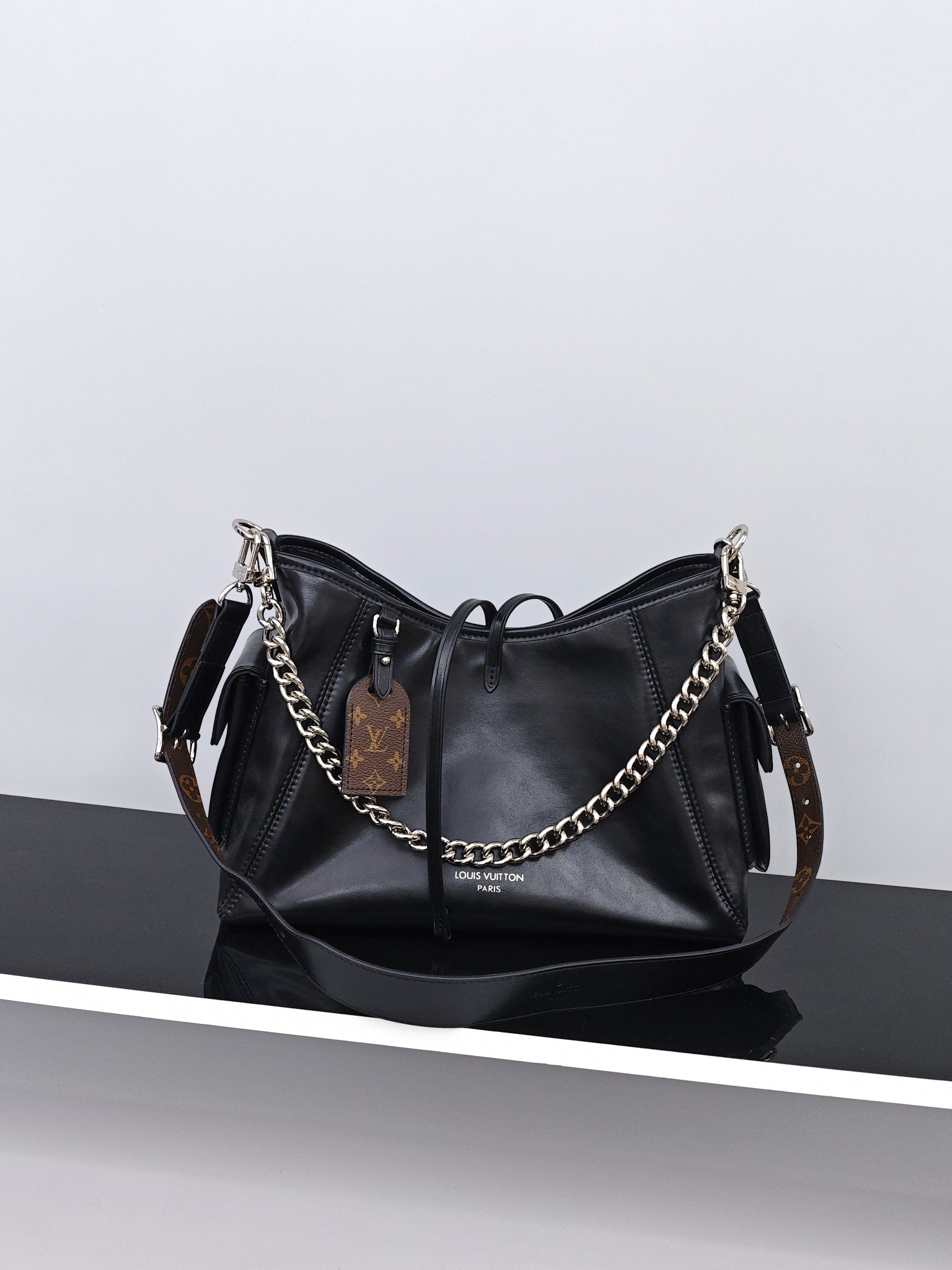 Lv Carryall黑武士💰320|小号 尺寸:33.5×23×15cm 特点:上身随性慵懒,通勤好搭档。 方式:吸磁式开合,内部空间可放下大屏ipad等随身物品,适合通勤旅行,搭配金属链条+两侧口袋,功能性很好,肩带可调节长短。