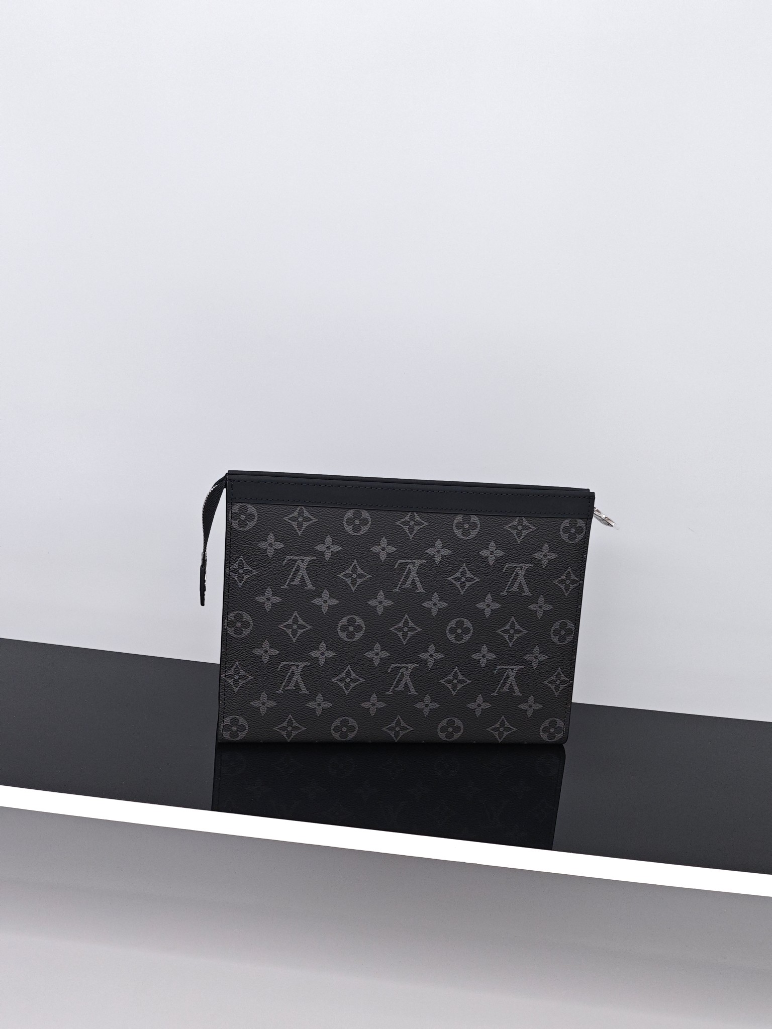 Lv手拿包💰240 尺寸:27×21×3cm 标志性黑灰Monogram Eclipse帆布裁制而成,此款风格硬朗的全新Pochette Voyage中号手袋可轻松收纳个人必备物品。