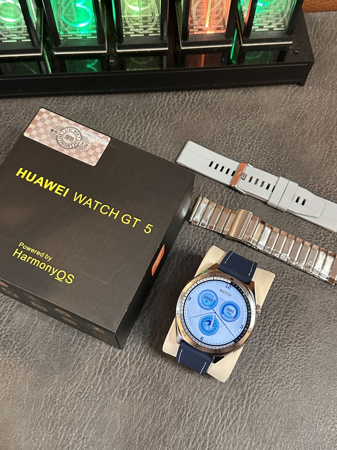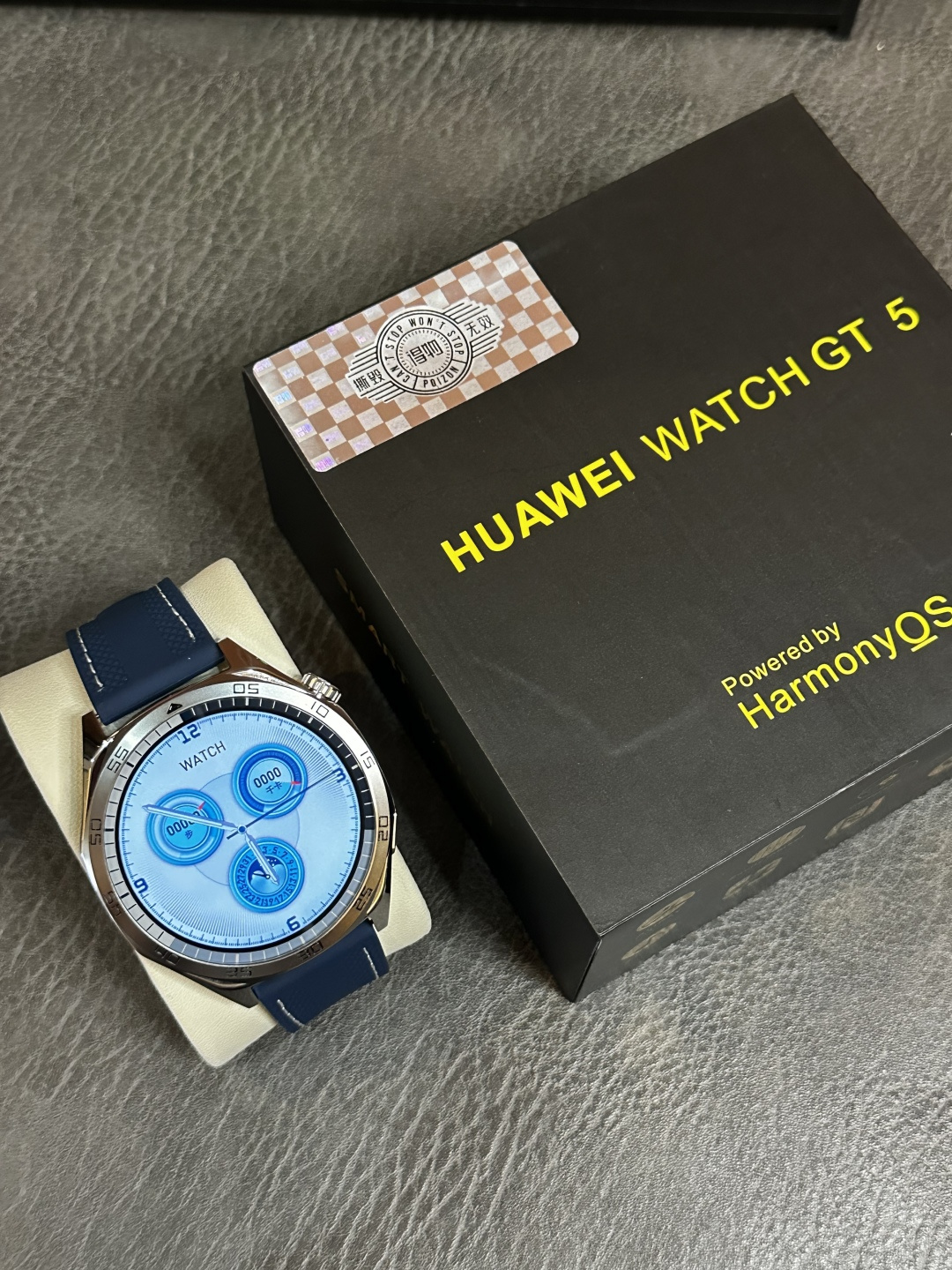 全新升级原装包装‼️批💰220 华为HUAWEI GT5 智能手表 托帕蓝 升级原装包装 原装Oled屏 正确白蓝三拼陶瓷刻度圈 同步原装 表盘刻度/按钮跟原装一样 上手看不出假 升级钛合金边框 质感非常高 日常佩戴不怕磕碰 46mm钛合金边框 重量质感跟正品完全一样 市面没有任何同行能够做到如此完全1:1复刻 各位可以尽情对比 欢迎打脸 这就是原版开发的底气 功能全面升级‼️ 系统自带175种运动模式 准确记录各种运动数据 IP68级防水设计 再次刷新标准 生活防水无压力 真实心率检测 真实血氧检测 目前最稳定的智能手表 支持息屏显示 屏幕常亮 床头灯等功能 带支付宝离线支付 导航显示 NFC门禁 股市 内资小游戏 语音助手等50种功能 正品该有的我们也都有 给你正品般享受体验 自家开发app 可自定表盘壁纸 查看各种测量数据 绑定app后可接受微信消息 查看信息内容等 软件内置500+种表盘 长期更新表盘 全部免费使用 目前市面流畅度最高 不卡顿 建议各位到手慢慢挖掘‼️ 手表标配三条表带 手表无线充 说明书 等等 售后保修三个月 外观不磨损/屏幕膜不撕过可退换‼️ 👉