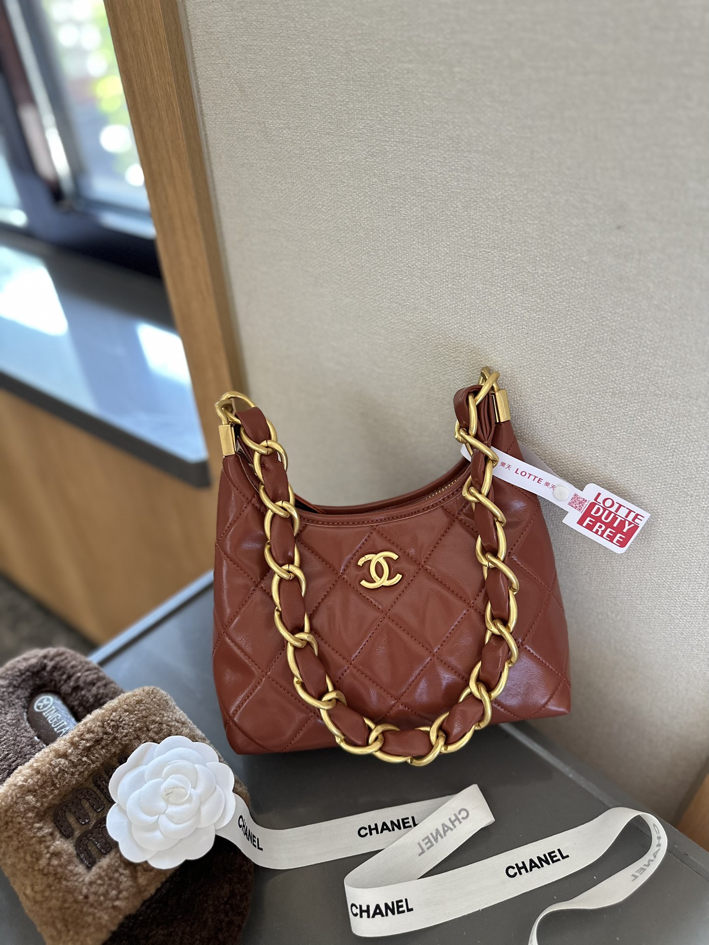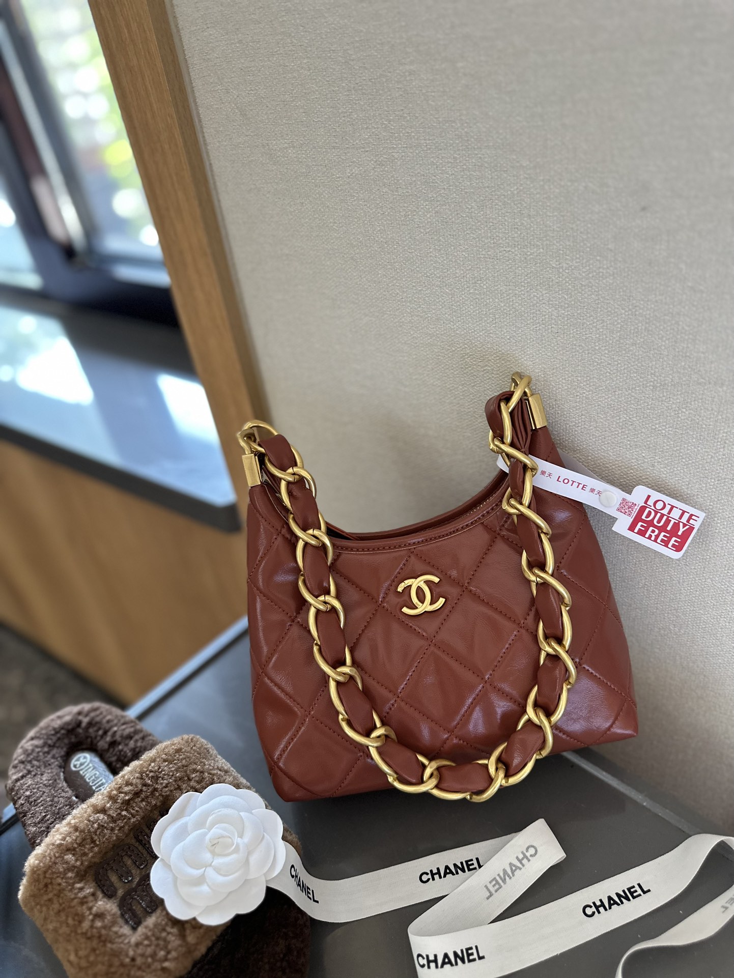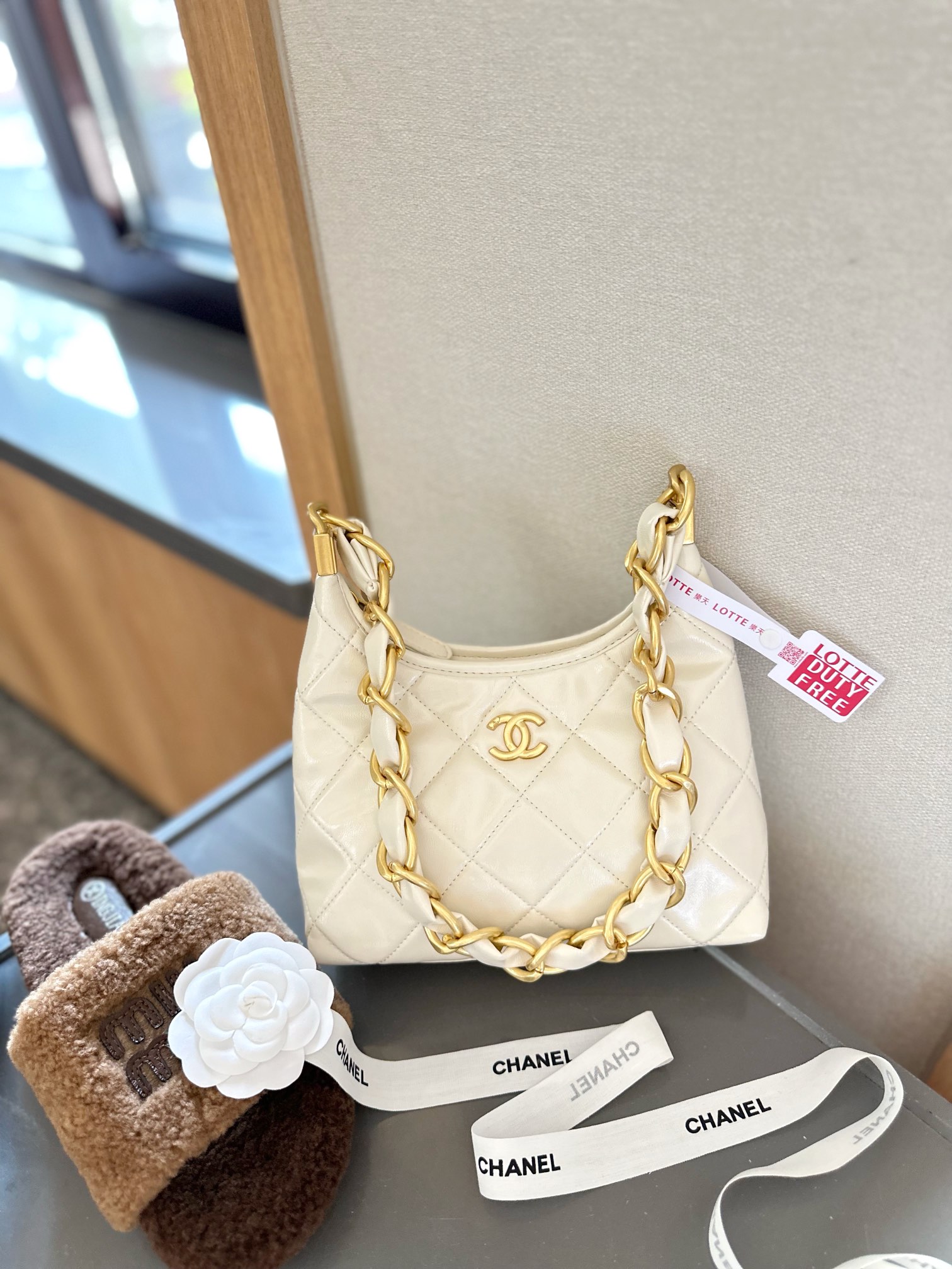 💰280 折叠礼盒包装 Chanel 香奈儿 24 新品 Hobo 腋下包 谁能拒绝一个能装又好看的hobo啊! 还是羊皮黑金hobo 而且链条也很特别 虽然链条是看起来是很沉的粗链条~ 但整个包身上身没什么重量 属于随手一背就出门的包! 而且油蜡皮真的很有质感! 尺寸24cm
