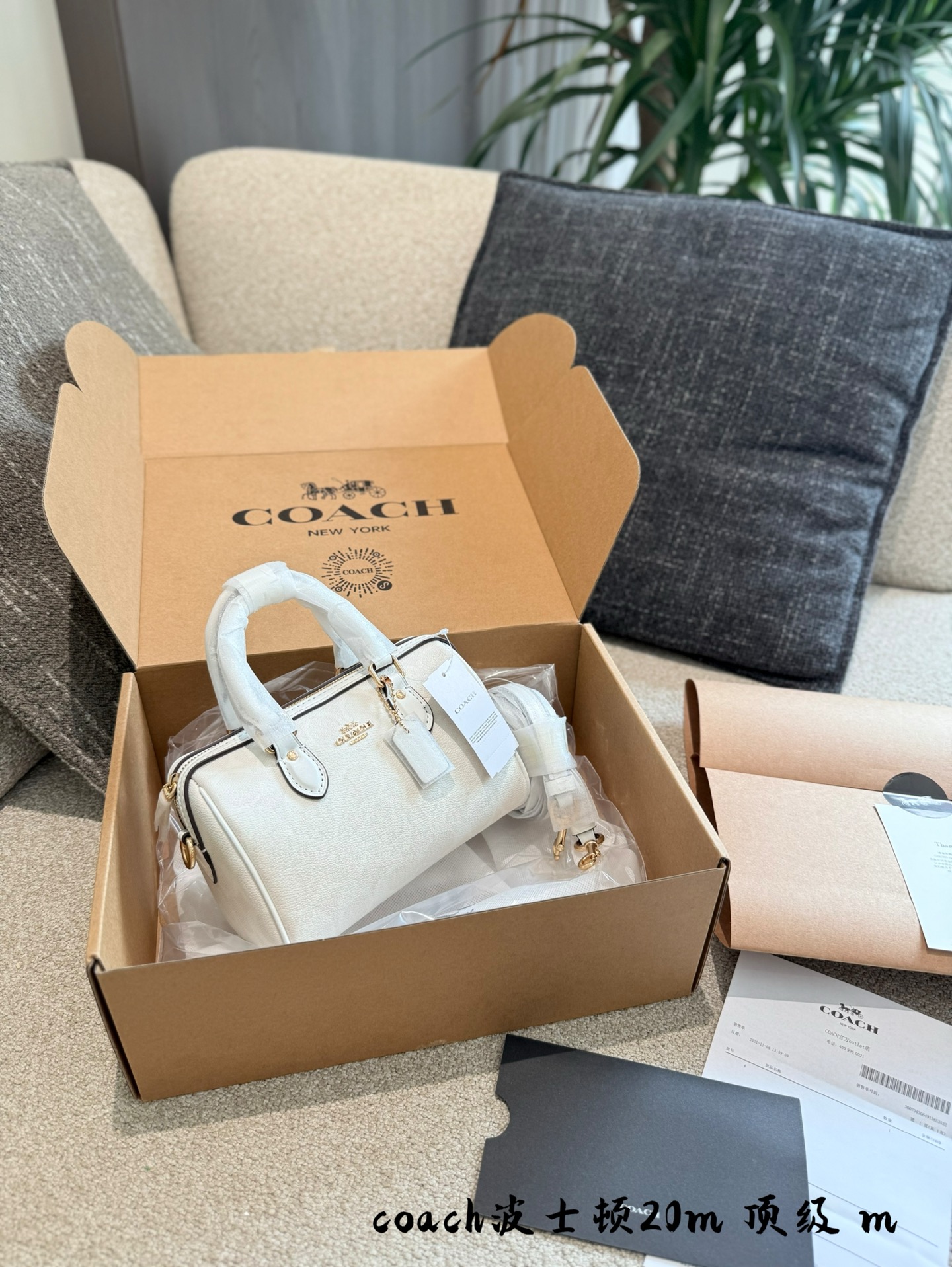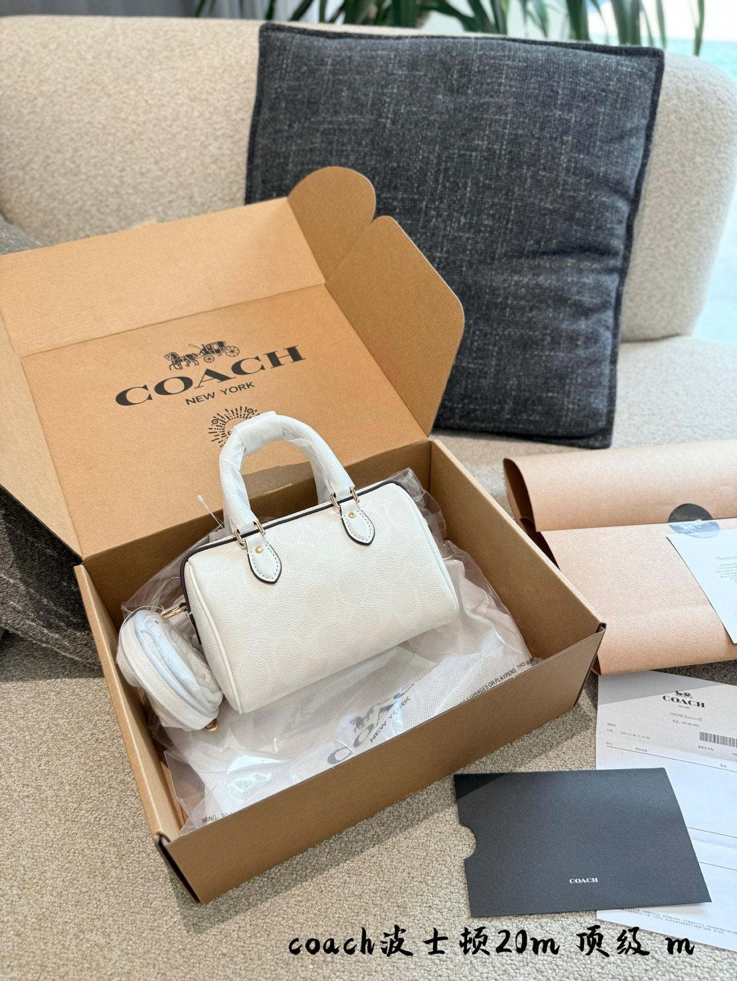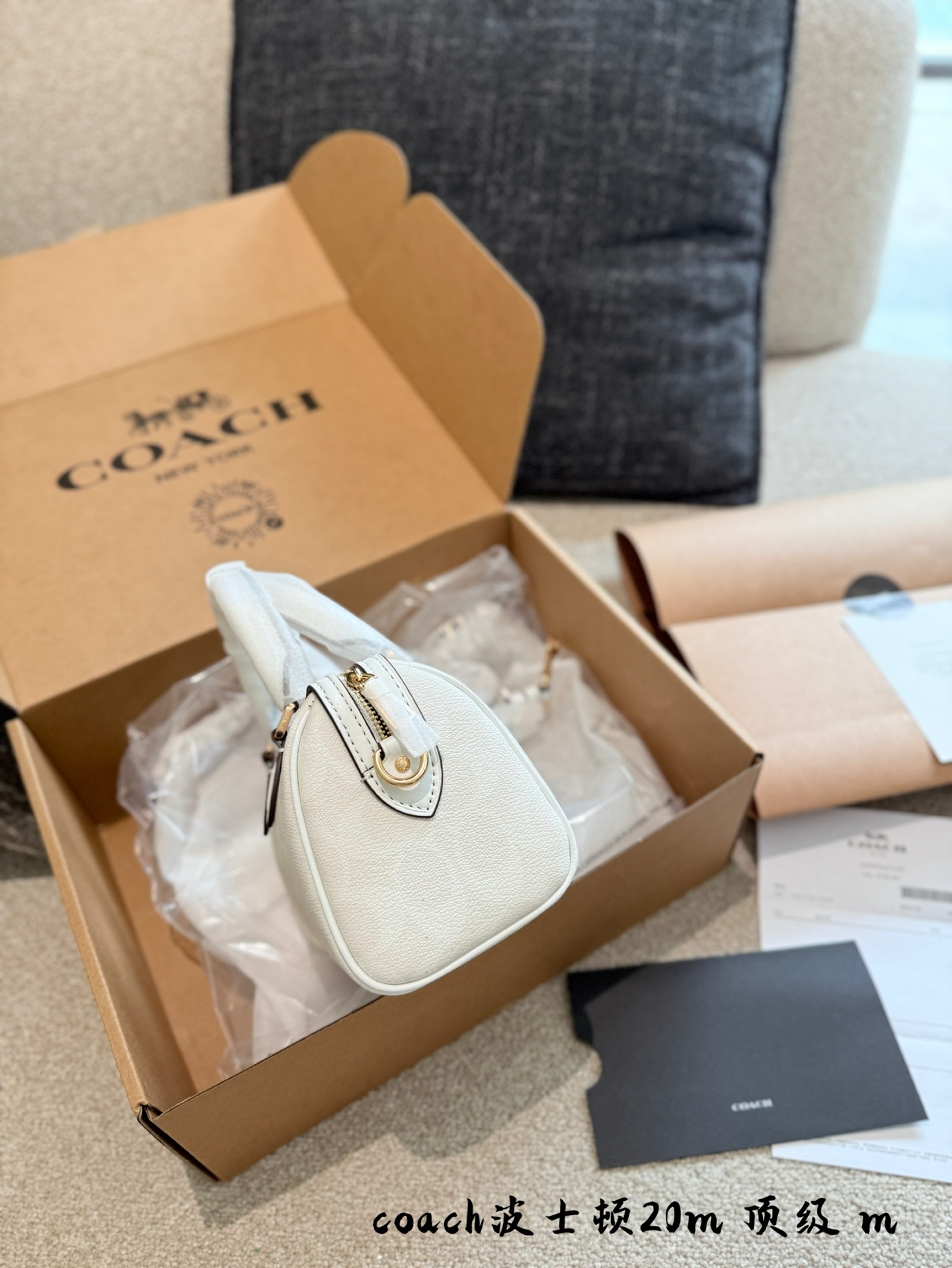 💰260 迷你波士顿包 | 掌心经典,一包多型✨ Coach蔻驰迷你波士顿 👜 浓缩优雅,掌心大小装下日常: 经典波士顿廓形微缩,轻松收纳手机+口红+钥匙,通勤约会都不慌乱~ 💼 一包解锁3种背法: 可手提/单肩/斜挎,皮质肩带,甜酷切换超随心! 🌿 材质升级更耐造: PVC老花涂层面料防水耐脏,雨天也能保持精致! 🎨 配色玩转春夏季: 冷酷冰川白,搭配金色配件金属,低调中透着高级感~ 👉 小个子友好+巨能装,背出不费力的时髦感! 💕尺寸长17.5cm 宽10cm 高12cm