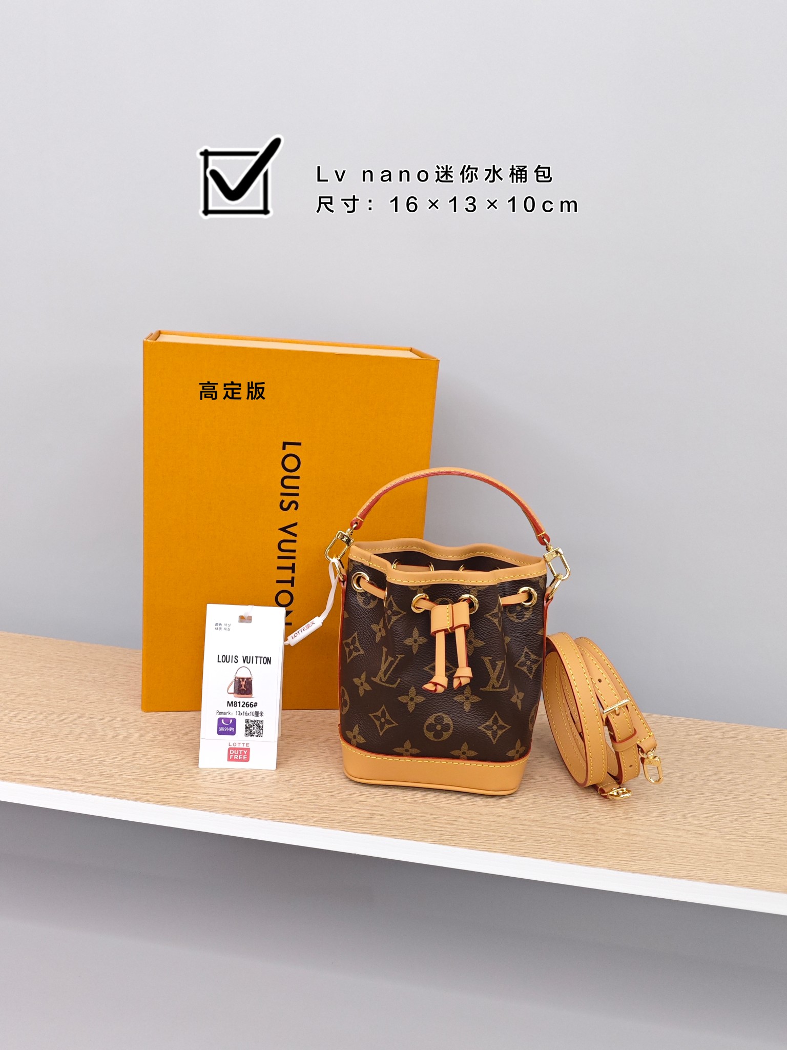 Lv nano迷你水桶包💰240《高定版》 尺寸:16×13×10cm 特点:高级精致小巧,四季百搭。 简介:抽绳式开合,内部空间可放下手机等日常随身小物品,搭配手腕带及长肩带,可手拎/可斜挎背。