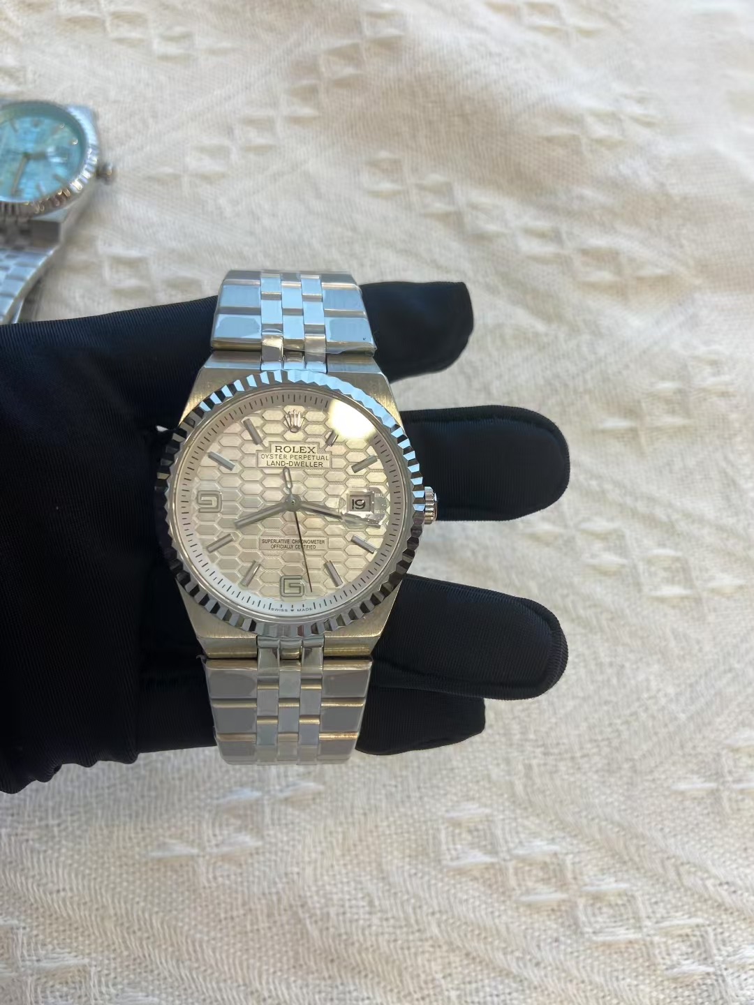 ♛ 💰530金+20钻+50劳力士 新款 🔥爆款推荐 陆使型 40mm 顶级品质 出货实拍🏅️KX7 ♛ 劳力士全新 Land-Dweller 陆使型于 2025 年推出,采用了一体式表链设计,这种设计灵感源自 1969 年 Oysterquartz Datejust 腕表,以及 1974 年面世的日志型腕表,表壳与表链之间呈现出无缝连接的流畅线条。 表盘设计灵感来自大自然,以蜂巢纹理呈现经典布局,直径:40mm 毫米的尺寸,白色、冰蓝色表盘。超薄表壳这使得其在劳力士的运动表款中显得尤为纤薄。 搭载进口独家定制7135夹板机芯,走时精准稳定,零返修!防刮花耐磨蓝宝石镜面,904精钢表壳跟表带精磨拉丝抛光打造🎁送礼最佳奢华推荐💥请认准独家品质📷