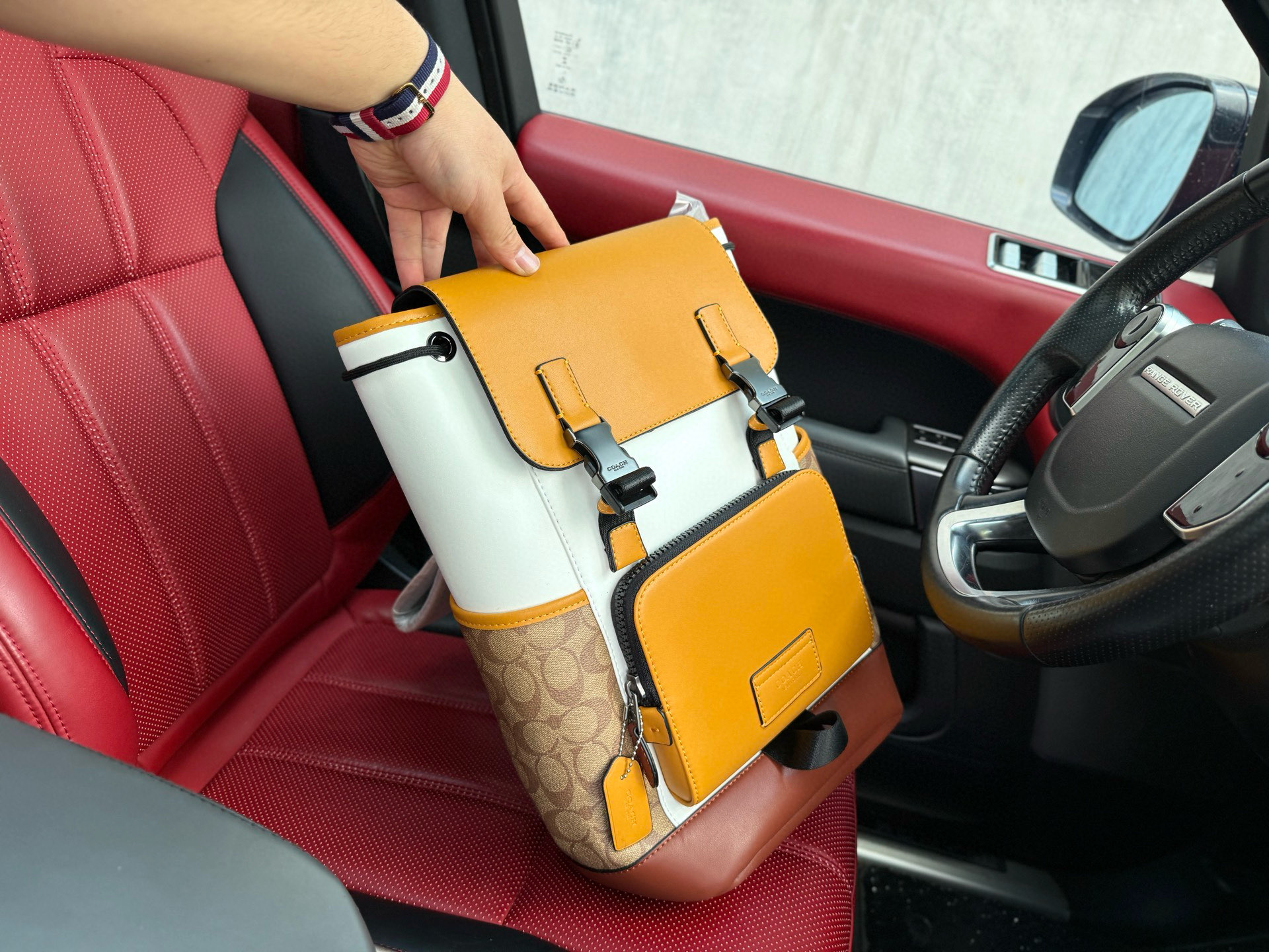 💰280 📷高端货‼️ 新款 “ COACH ”蔻驰双肩包 💼 coach蔻驰双肩包 COACH蔻驰 Track 27 拉绳卡扣开合拼色 牛皮革配织物 书包背包双肩包 大号 男款 卡其色拼蜂巢黄色 内设电脑隔层 拉链暗袋 高清五金logo标志、专用里内里。顺滑拉链、油边平滑、做工精致每个细节到位!潮男必备款 尺寸:28x40x15cm