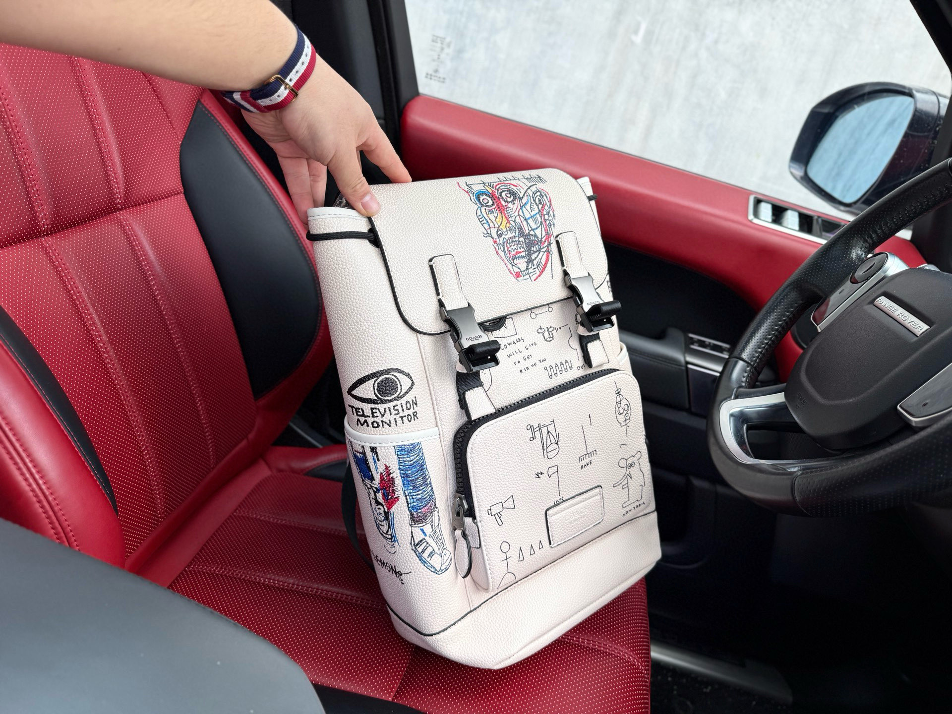 💰300 📷高端货‼️ 新款 “ COACH ”蔻驰双肩包 💼 coach蔻驰双肩包 COACH X Basquiat 蔻驰 Track 27 联名款 涂鸦翻盖书包背包双肩包 中号 男款 粉笔白色 内设电脑隔层 拉链暗袋 高清五金logo标志、专用里内里。顺滑拉链、油边平滑、做工精致每个细节到位!潮男必备款 尺寸:28x40x15cm
