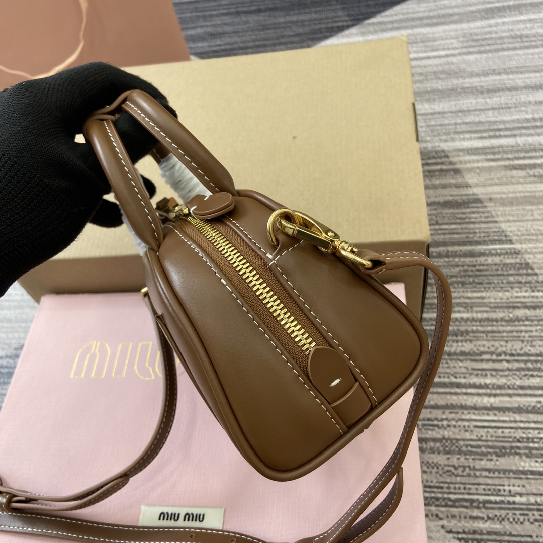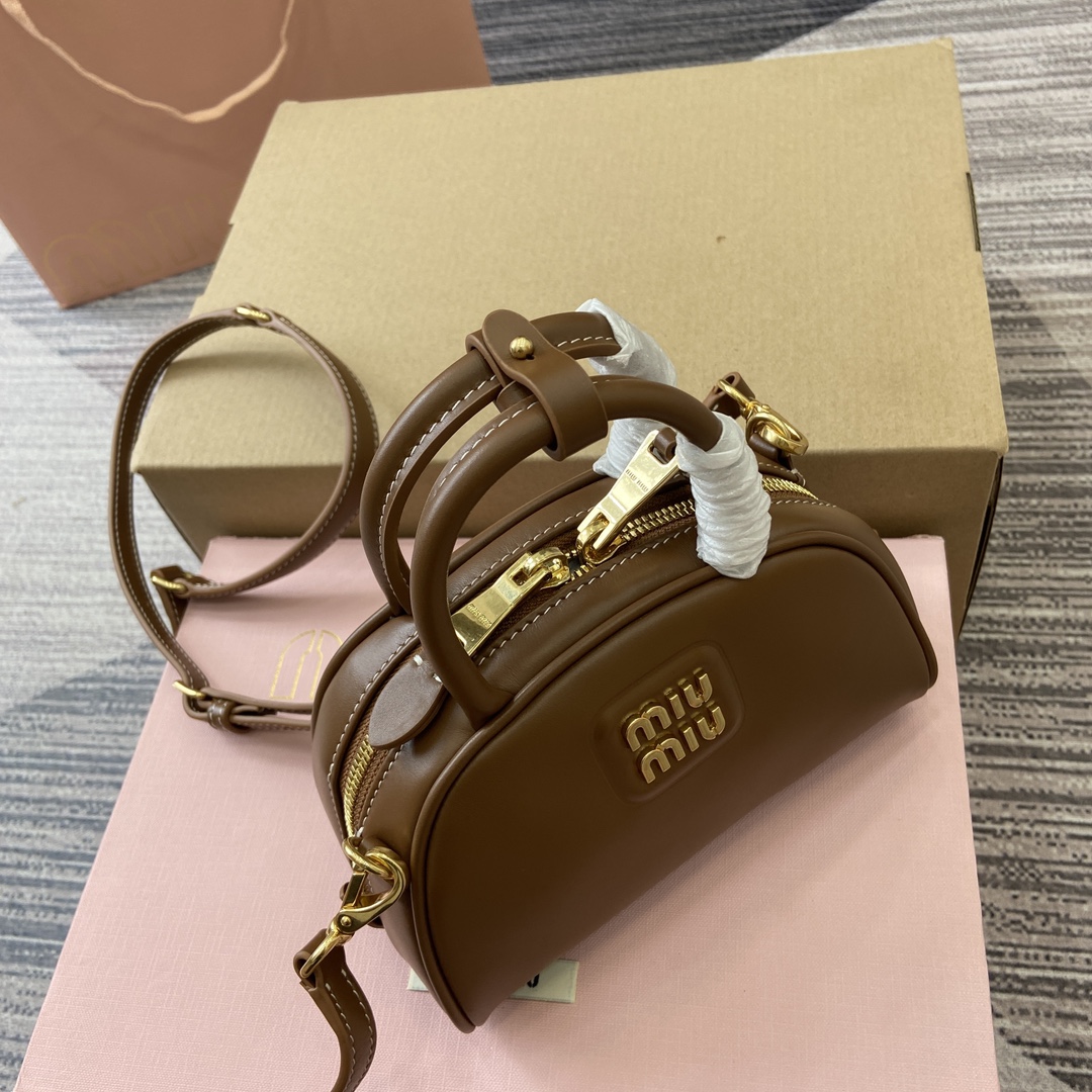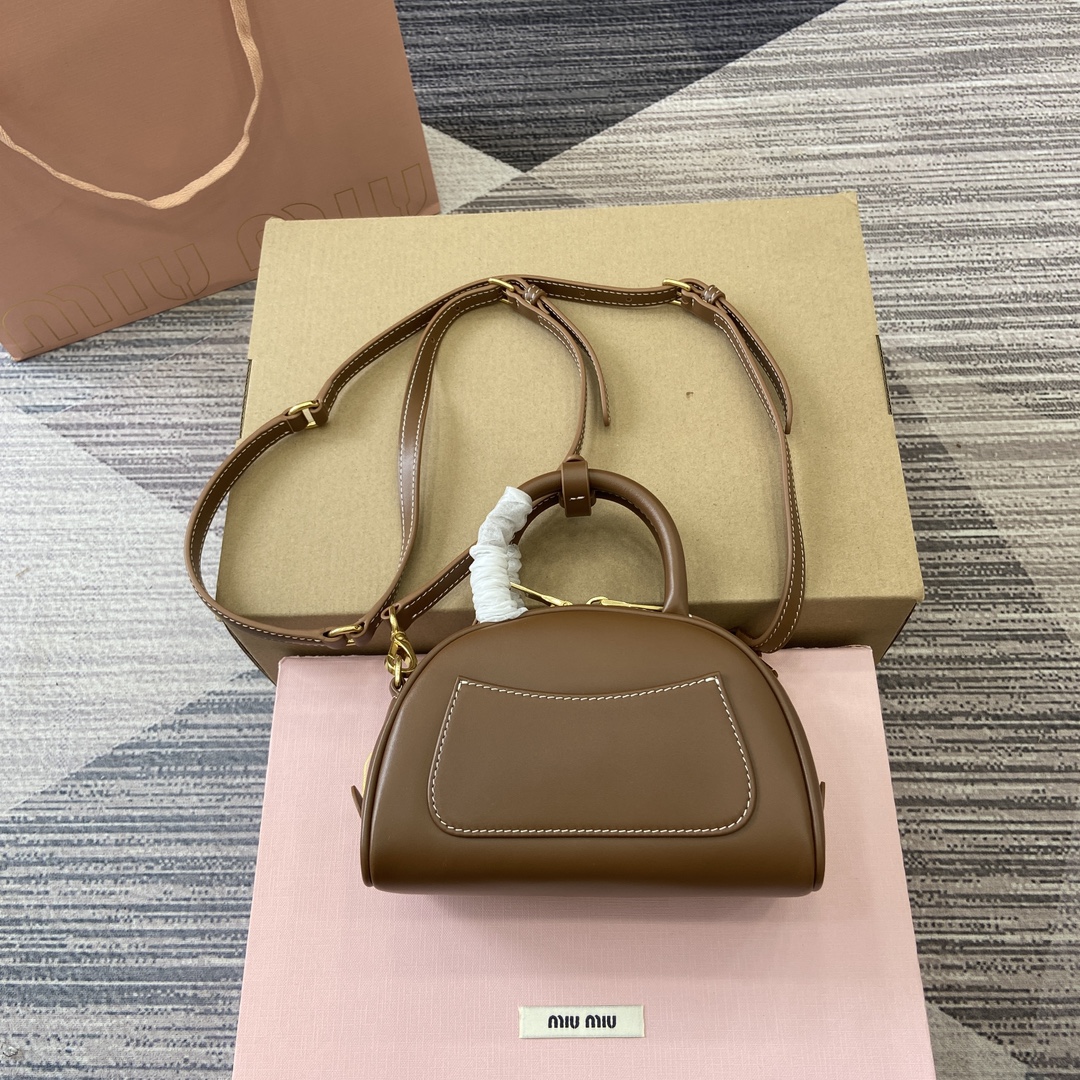 配全套专柜包装】‼️Miu家秀款饺子包,官网主推,今年绝对爆🔥款式,采用顶级进口小牛皮,时尚半圆设计,包身精致立体有型,风格百变,适配度很高,日常出行怎么搭都好看,正面标志性金属logo标,可拆卸可调节皮革长肩带,棉质缎面衬里,小号是精致的小可爱 型号:5BC085。 尺寸:18X11.5X8Cm 颜色:棕色全皮。 意大利创作